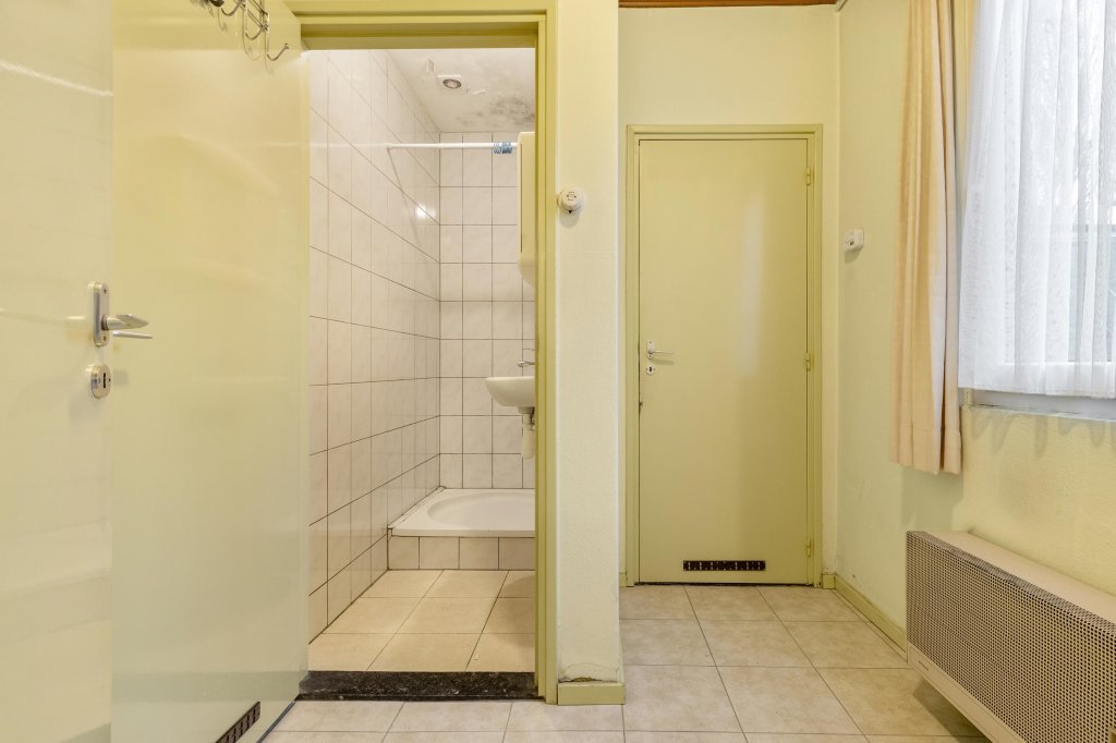 De volledig betegeld badkamer is voorzien van een wastafel en douche.
