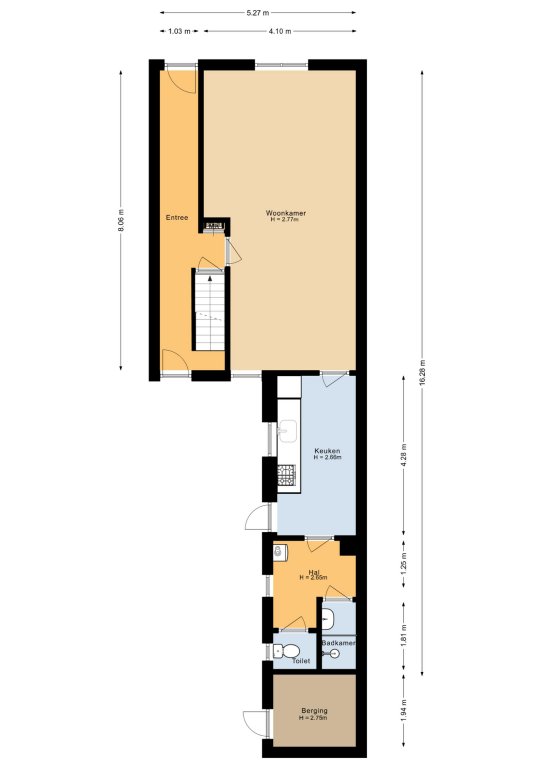 Entree/hal met toegang tot de opgang verdieping, meterkast, woonkamer en keuken.