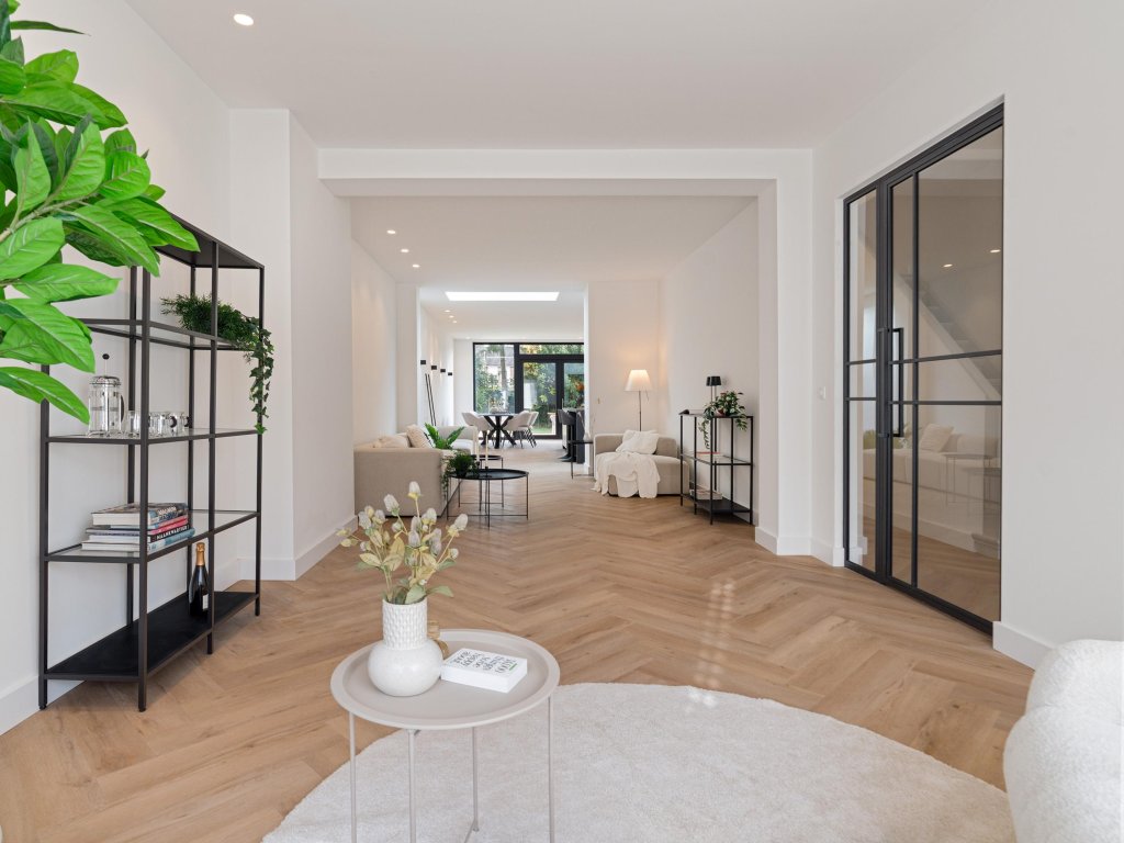 De ruime woonkamer met erker is een sfeervolle leefruimte met veel lichtinval. De combinatie van de visgraatvloer, glazen deuren en spotverlichting zorgt voor een moderne en warme uitstraling. De woonkamer loopt door in de eetkamer en open leefkeuken, waar ruimte, licht en stijl samenkomen.