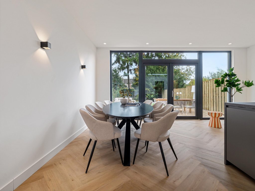 De ruime woonkamer met erker is een sfeervolle leefruimte met veel lichtinval. De combinatie van de visgraatvloer, glazen deuren en spotverlichting zorgt voor een moderne en warme uitstraling. De woonkamer loopt door in de eetkamer en open leefkeuken, waar ruimte, licht en stijl samenkomen.
