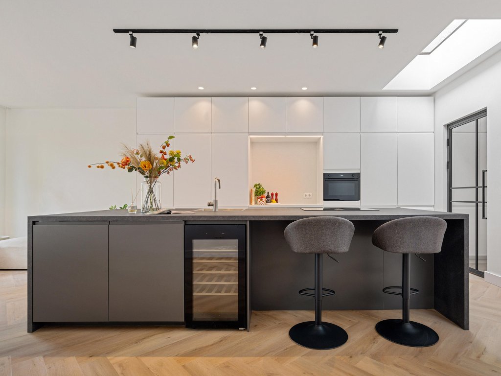 - Moderne leefkeuken met kookeiland, wijnkoeler en lichtkoepels;