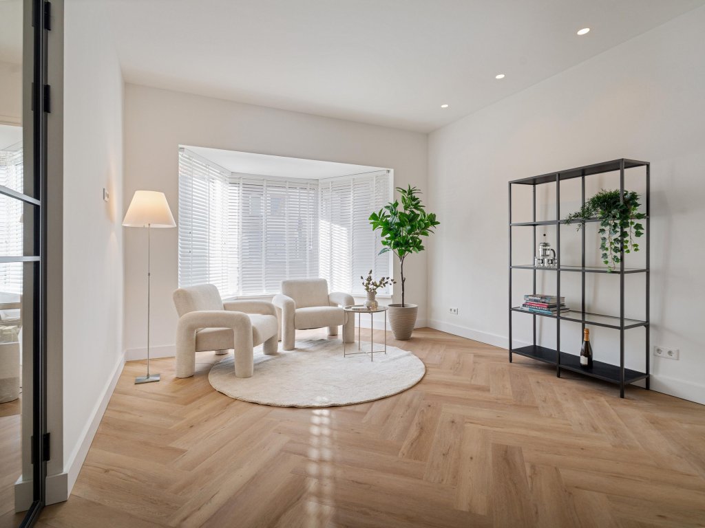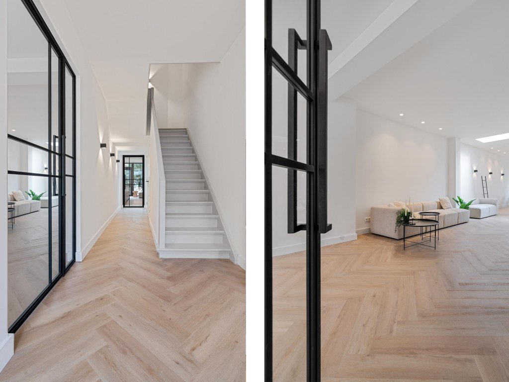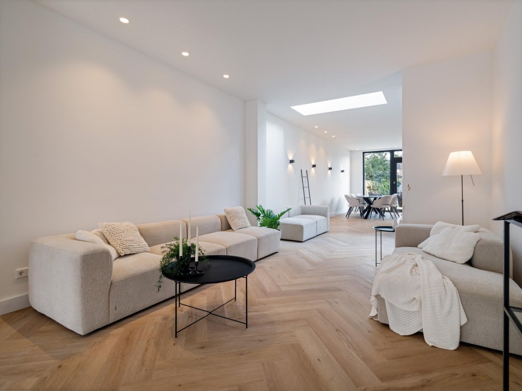 De ruime woonkamer met erker is een sfeervolle leefruimte met veel lichtinval. De combinatie van de visgraatvloer, glazen deuren en spotverlichting zorgt voor een moderne en warme uitstraling. De woonkamer loopt door in de eetkamer en open leefkeuken, waar ruimte, licht en stijl samenkomen.