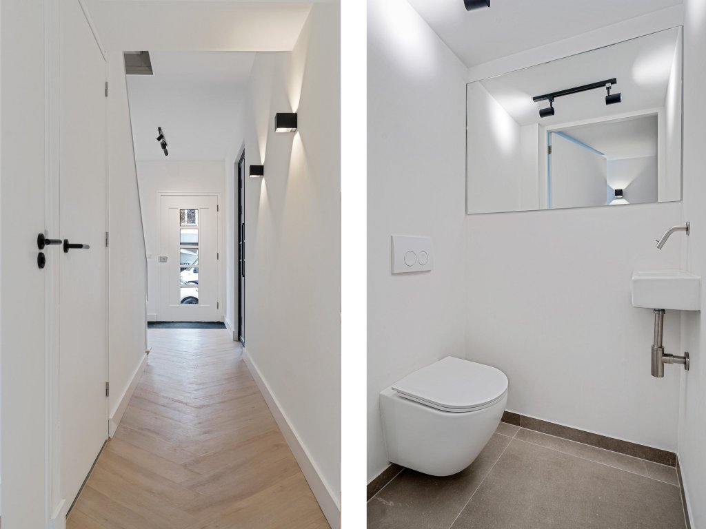 De woning wordt betreden via de stijlvolle hal, waar direct de hoogwaardige afwerking opvalt. In de hal bevindt zich de meterkast en het moderne toilet met fonteintje en spiegel. Vanuit de hal is er toegang tot de vaste trap naar de kelder, de woonkamer, de leefkeuken en de trappartij naar de verdiepingen.
