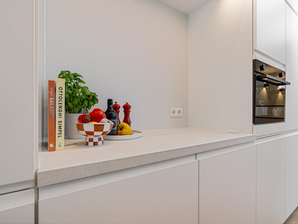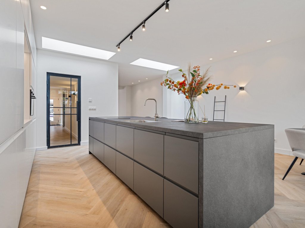 De leefkeuken is een echte eyecatcher met een uitbouw voorzien van twee lichtkoepels, een luxe kookeiland en een complete set inbouwapparatuur, waaronder een wijnkoeler. De glazen wand zorgt voor een overvloed aan daglicht en via de openslaande tuindeuren is de achtertuin bereikbaar.