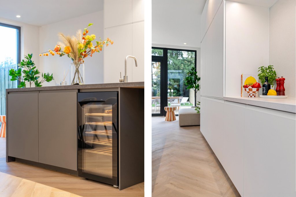 - Moderne leefkeuken met kookeiland, wijnkoeler en lichtkoepels;