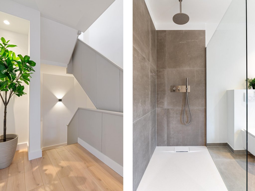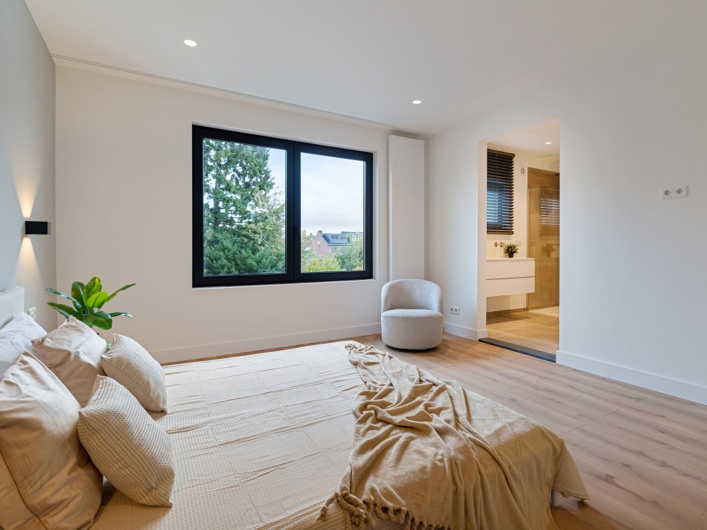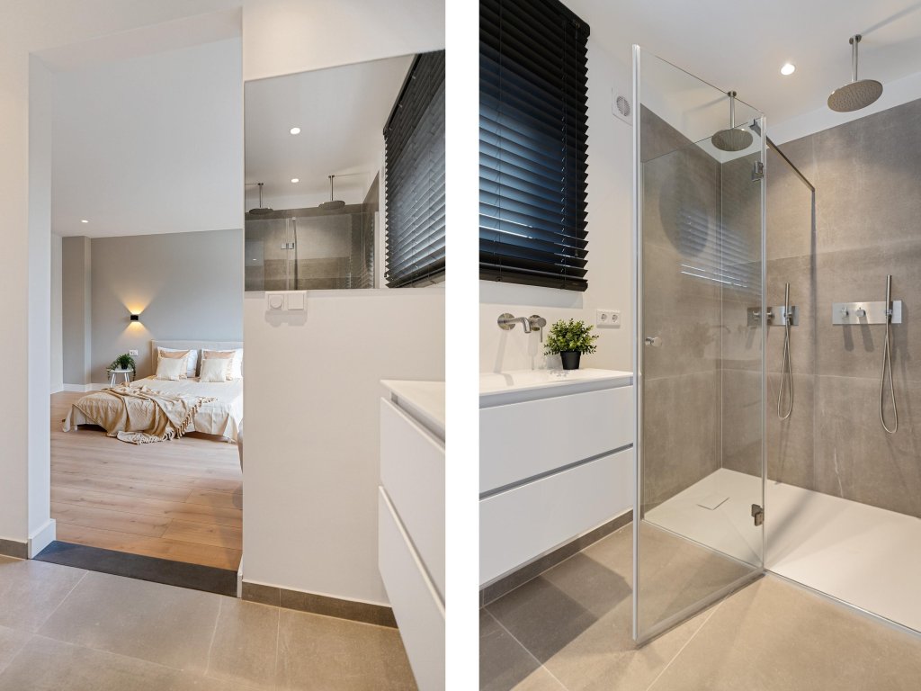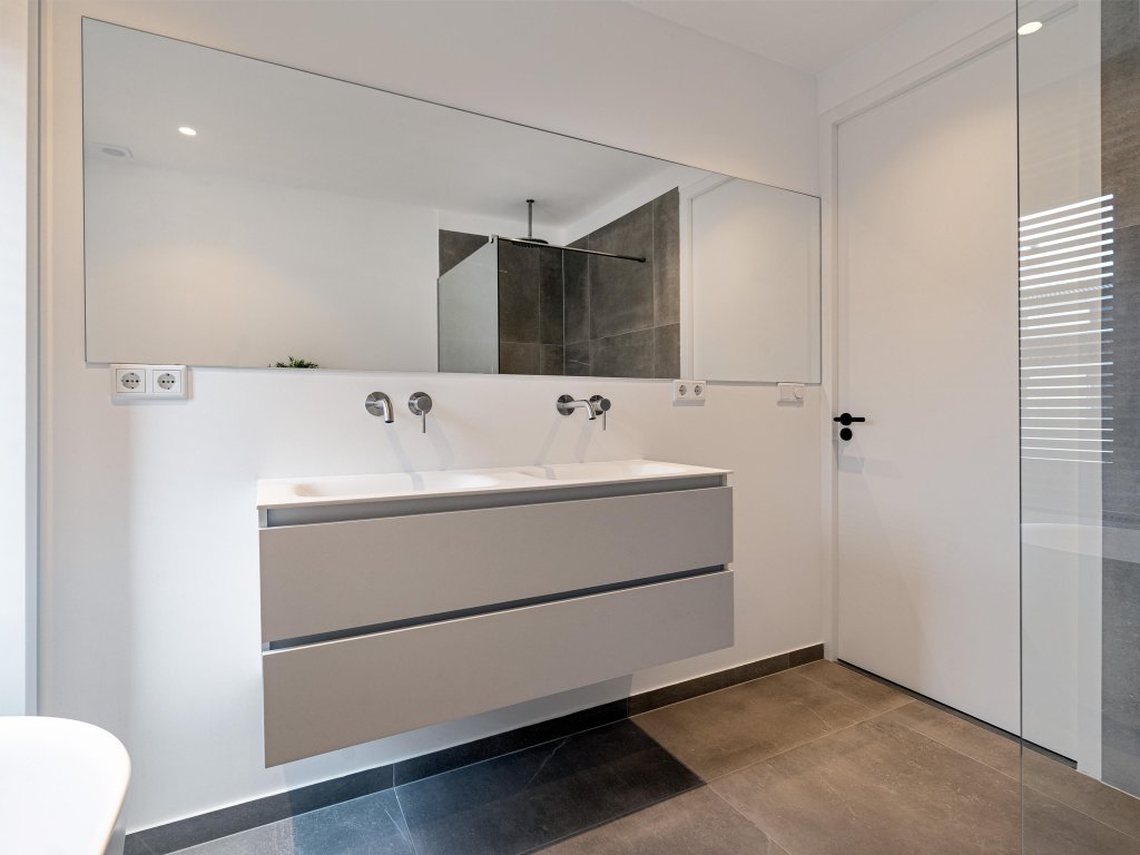 De tweede badkamer is royaal van opzet en biedt een vrijstaand ligbad, een dubbele wastafel met zwevend badmeubel, toilet en een inloopdouche met glazen scheidingswand, waardoor comfort en luxe hand in hand gaan.