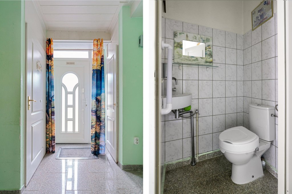 Via de entree/hal met meterkast bereikt u de deels (3/4) betegelde toiletruimte, voorzien van een toilet en fonteintje.