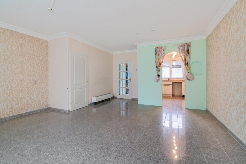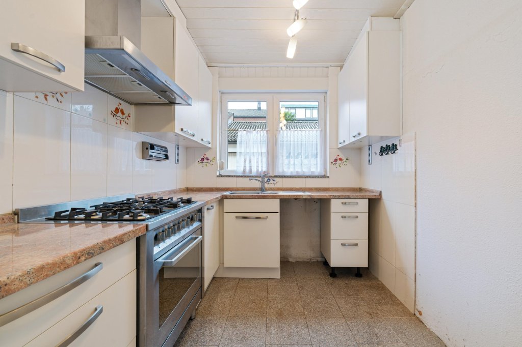 De ruime en lichte woonkamer is afgewerkt met een tegelvloer en beschikt over een praktische trapkast. De semi-open L-vormige keuken is uitgerust met apparatuur, waaronder een gasfornuis met oven en een afzuigkap.