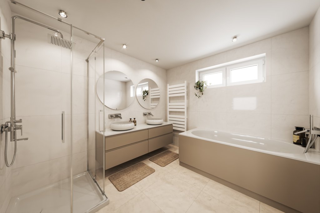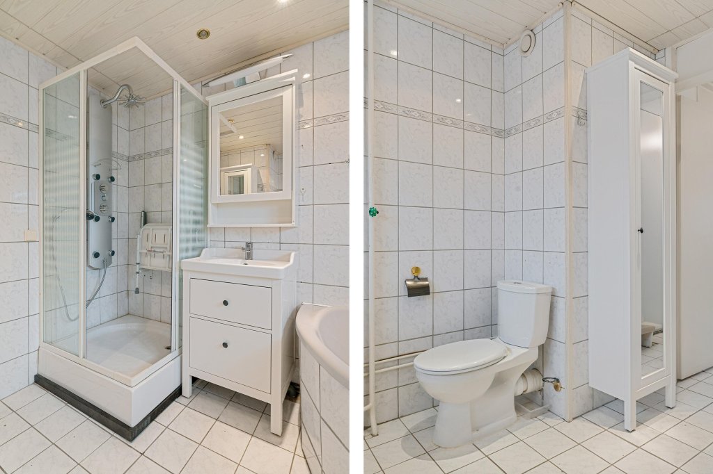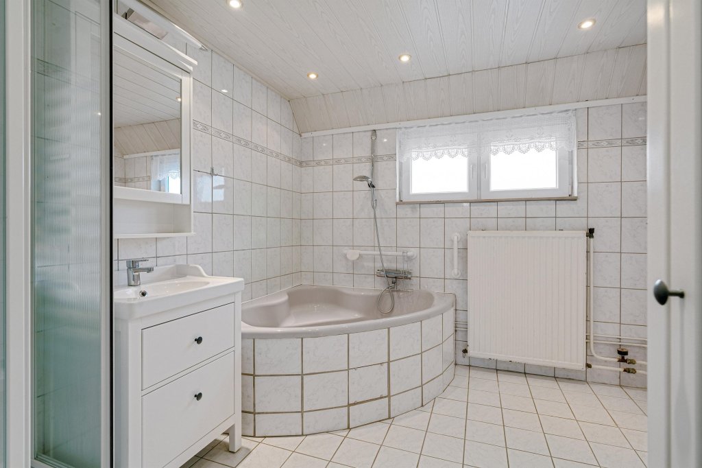 De volledig betegelde badkamer is compleet uitgevoerd en voorzien van een hoekligbad, douche, tweede toilet, vaste wastafel met meubel, designradiator en daglichttoetreding.