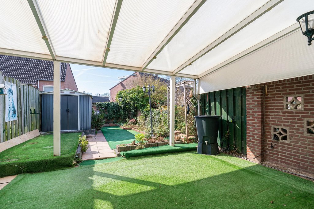 Via openslaande deuren in de woonkamer heeft u direct toegang tot de achtertuin, welke is voorzien van een overkapping, terras, tuinhuis en een achteringang.