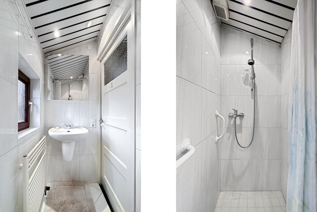 De geheel betegelde badkamer is compact en voorzien van een douche en vaste wastafel.