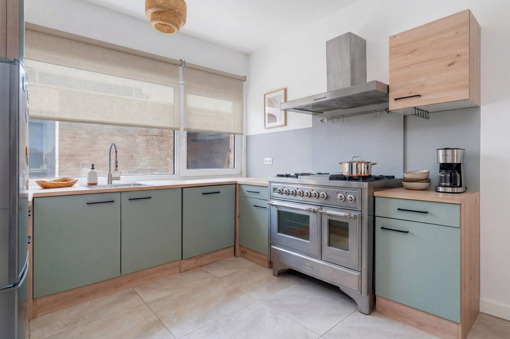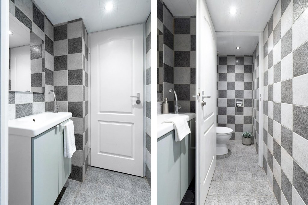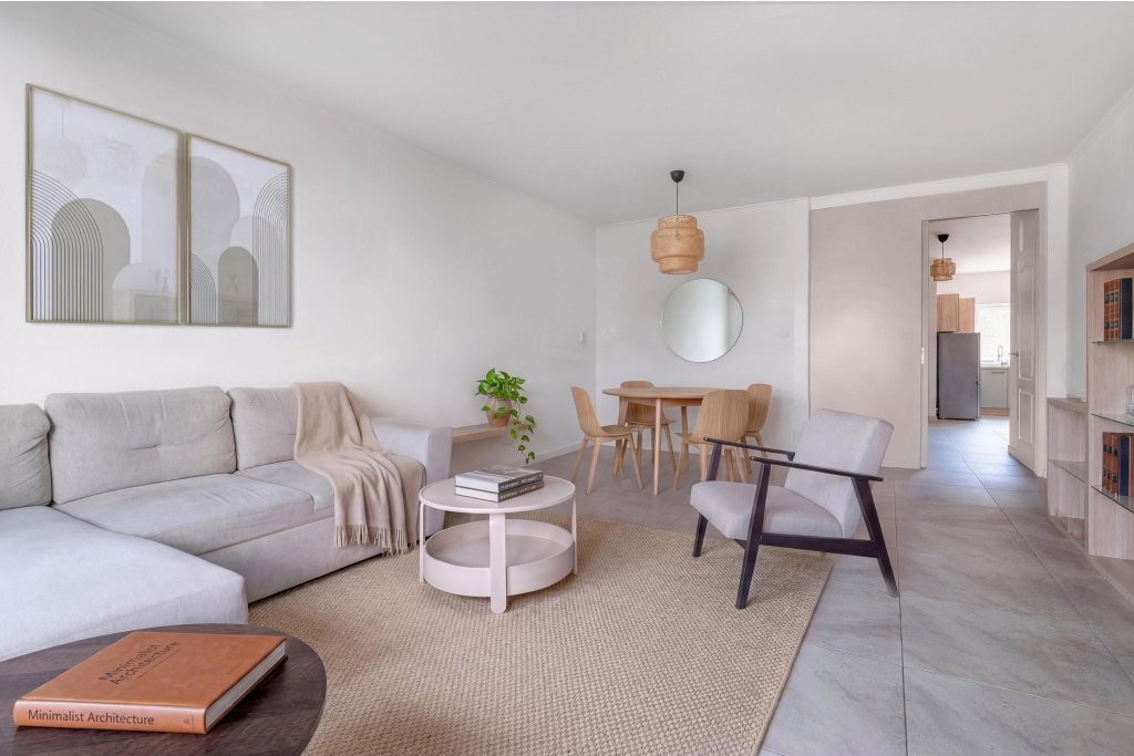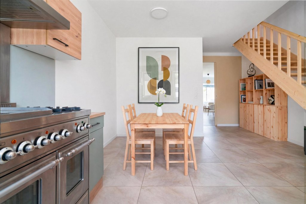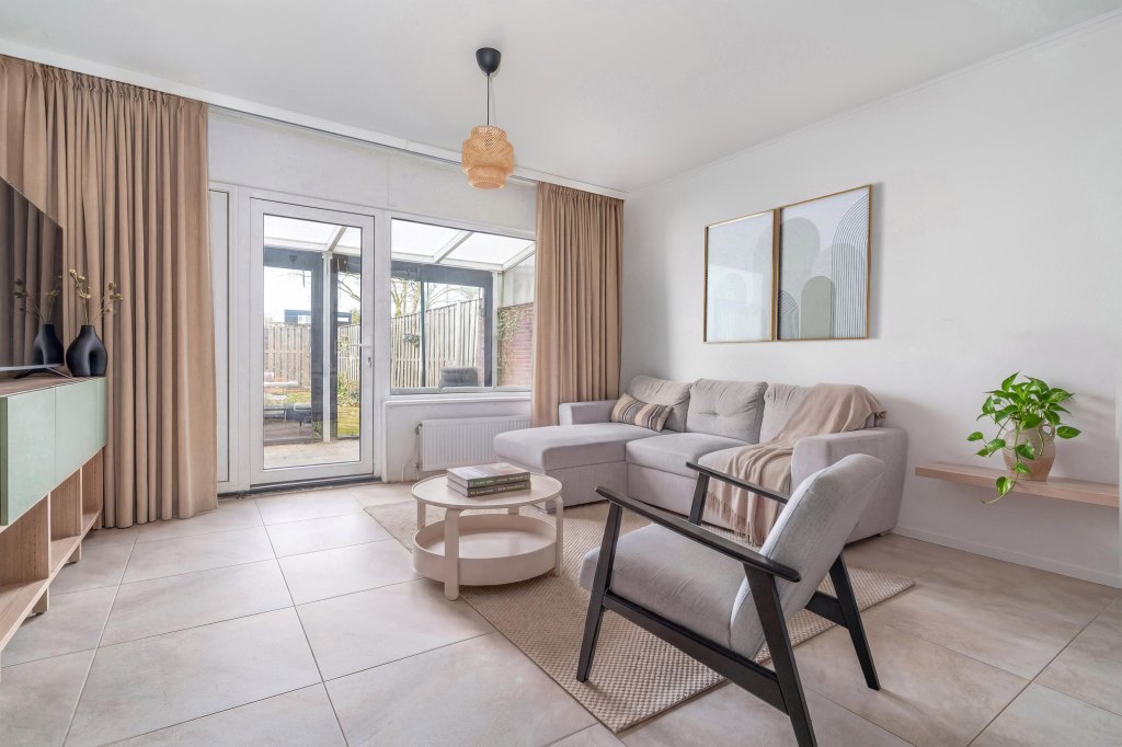 De leefkeuken biedt een open verbinding naar de ruime woonkamer. Dankzij de grote raampartijen en de toegang tot de tuin voelt de woonkamer licht en ruim aan. De gehele begane grond is afgewerkt met een nieuwe tegelvloer, wat zorgt voor een verzorgde uitstraling. In de doorgang tussen de keuken en de woonkamer bevindt zich de separate toiletruimte met hangend closet.