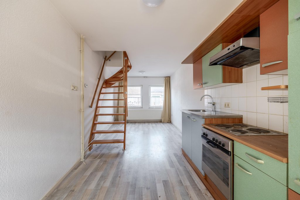 Op de eerste verdieping bevindt zich de woonkamer met een open, eenvoudig uitgevoerde keuken. De ruimte is praktisch ingericht en biedt diverse indelingsmogelijkheden. Vanuit de woonkamer bereikt u middels een vaste trap de tweede verdieping.