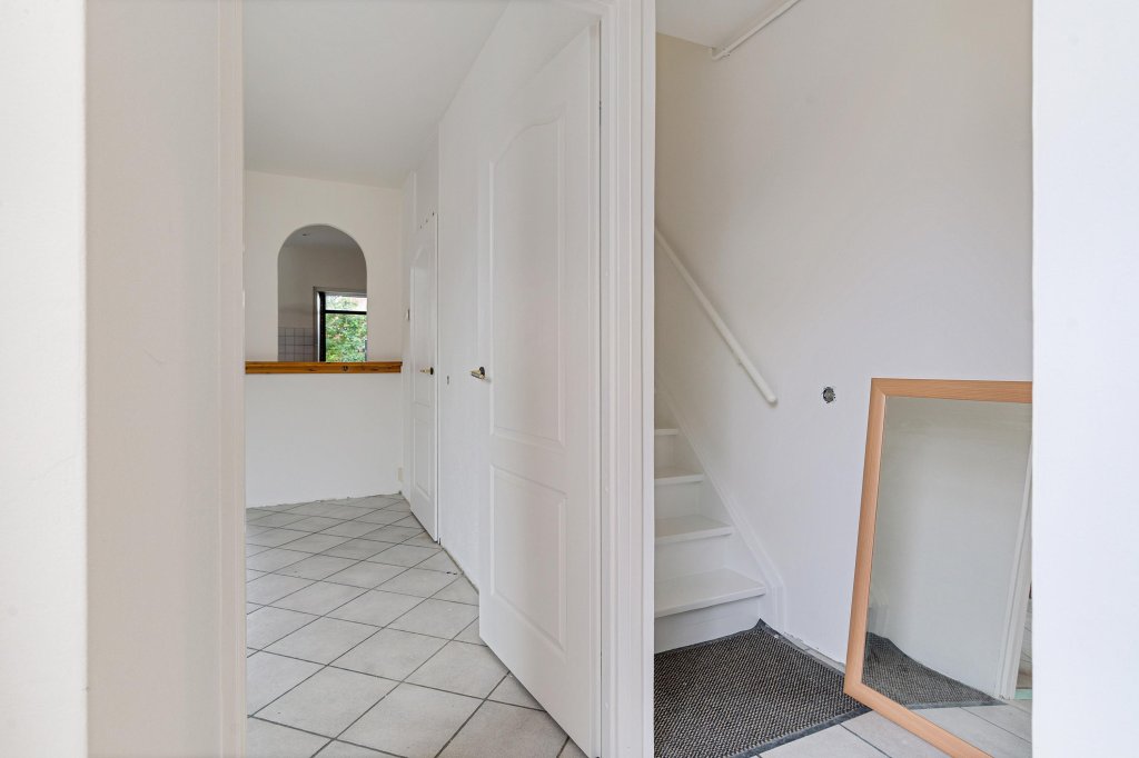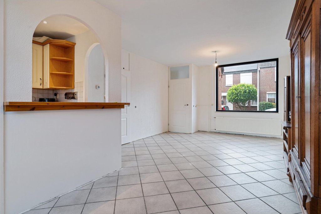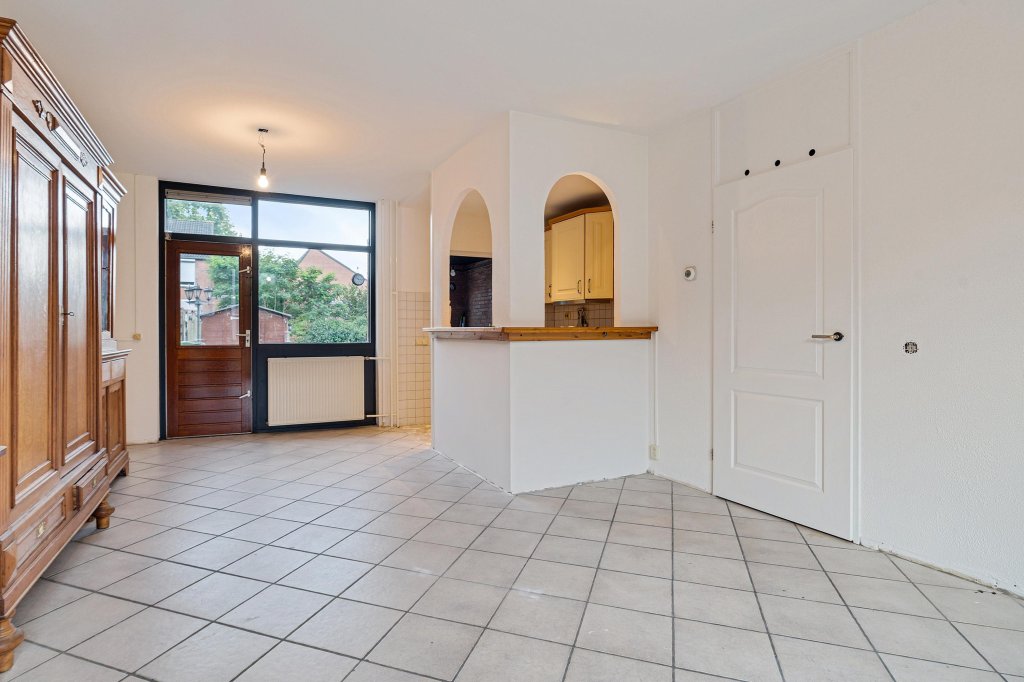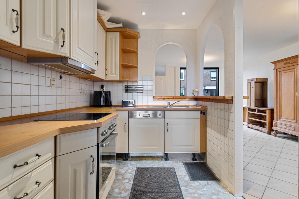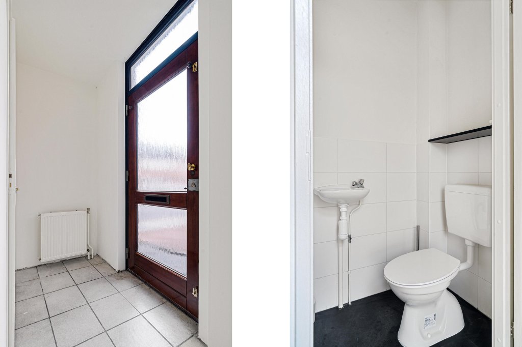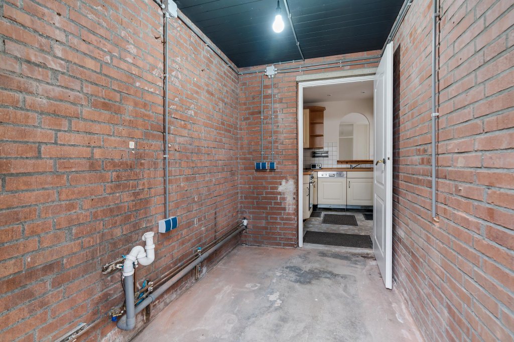 Entreehal met meterkast, toiletruimte en trapopgang. Open keuken met L-vormige inrichting voorzien van ingebouwde vaatwasser, koelkast, afzuipkap, oven en inductiekookplaat. Woonkamer met doorlopende tegelvloer, trapkast en toegang tot de achtertuin en wasruimte/berging.