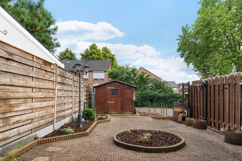 Achtertuin met terras, vrijstaande houten berging en achteringang.