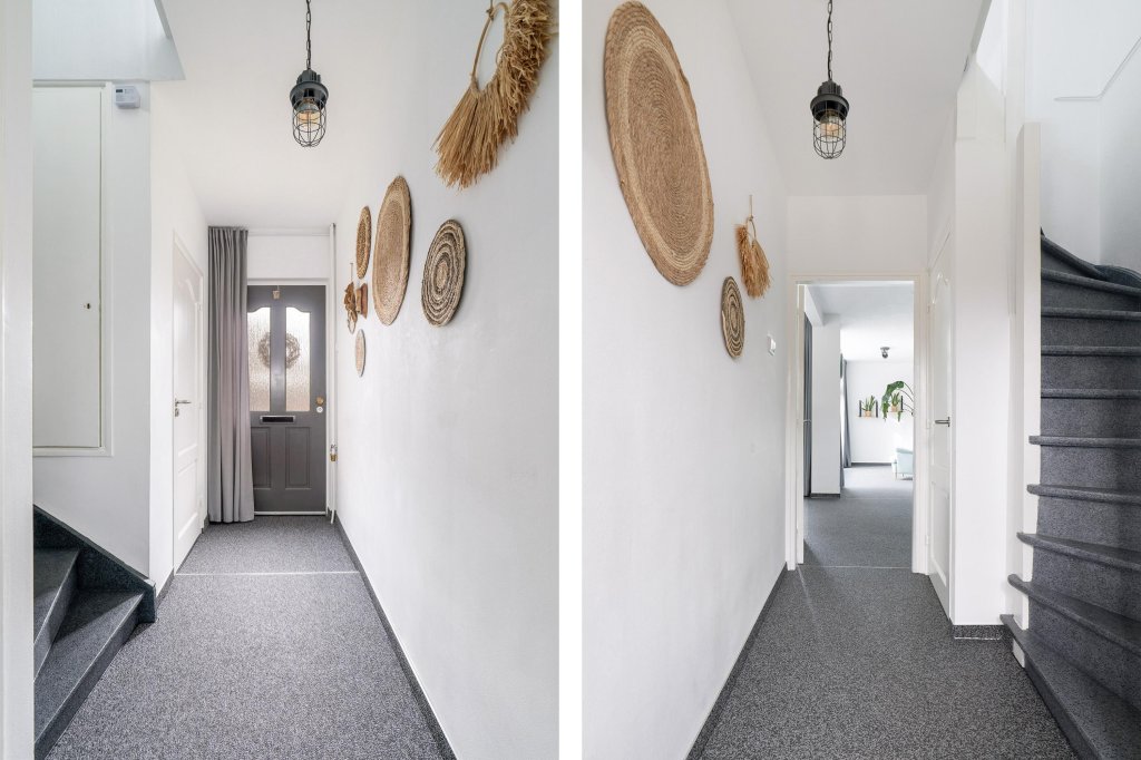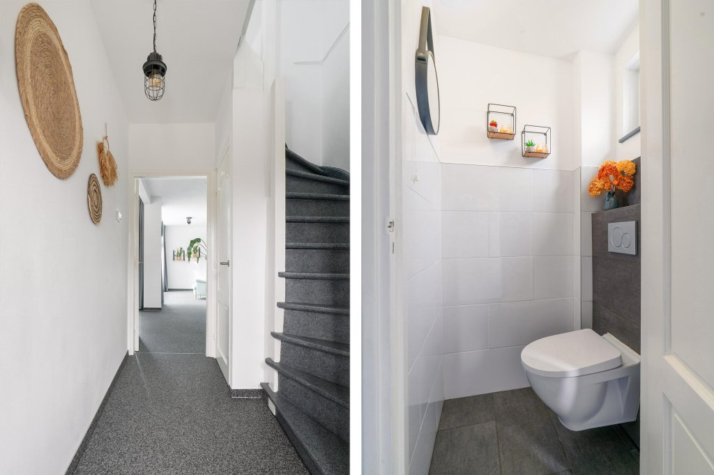 Via de entree komt u in de ruime hal met toegang tot het moderne, halfhoog betegelde toilet met hangcloset. Meterkast. Toegang tot kelder en de trap naar de eerste verdieping.
