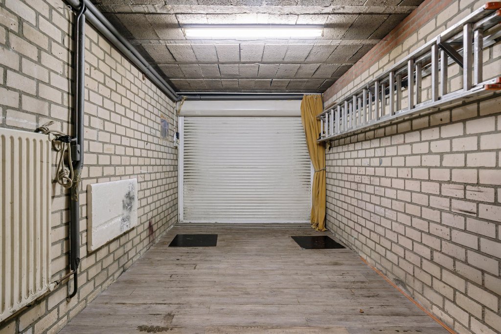 De inpandige garage biedt ruimte voor één auto, extra opslag, stookruimte en wasruimte.