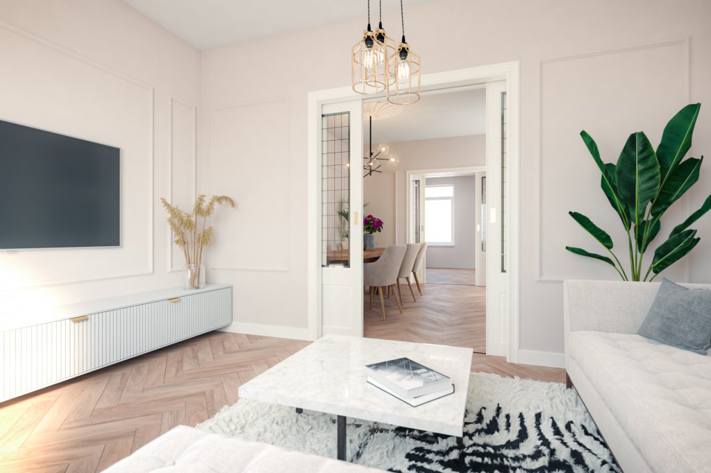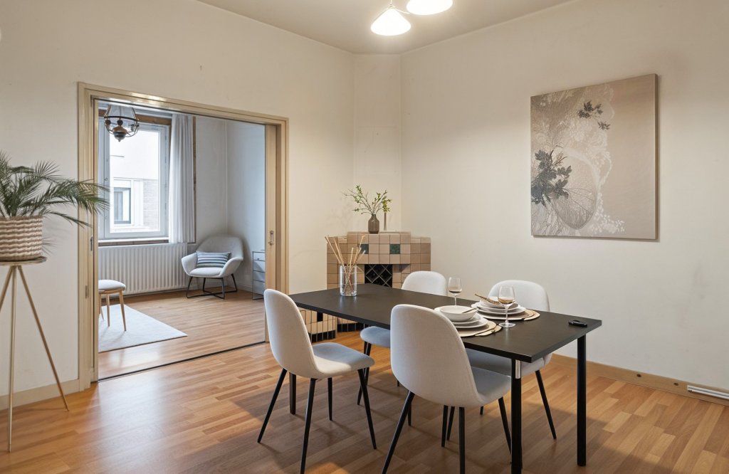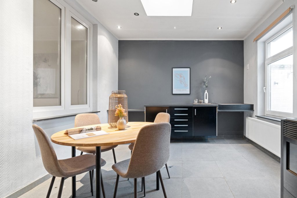 De eetkamer is voorzien van een laminaatvloer en heeft via een schuifdeur verbinding met de woonkamer – perfect om de ruimtes open of juist knus te houden.