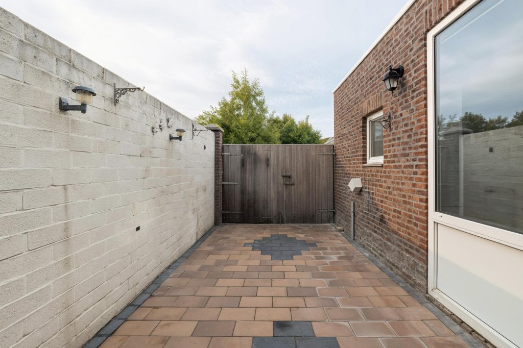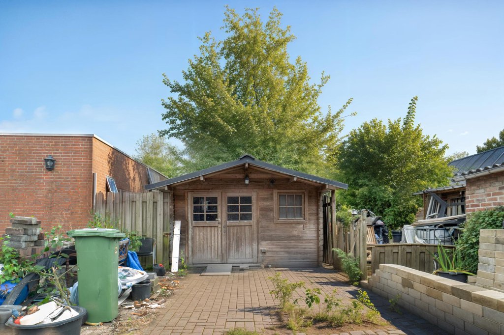 De achtertuin is bereikbaar via een steegje aan de achterzijde en biedt een combinatie van groen en bestrating. In de tuin staat een tuinhuis met openslaande deuren, perfect voor opslag of als buitenverblijf.