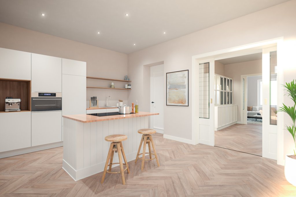 Aansluitend vind je de bijkeuken, die toegang geeft tot het apart toilet, de badkamer en de achterdeur.