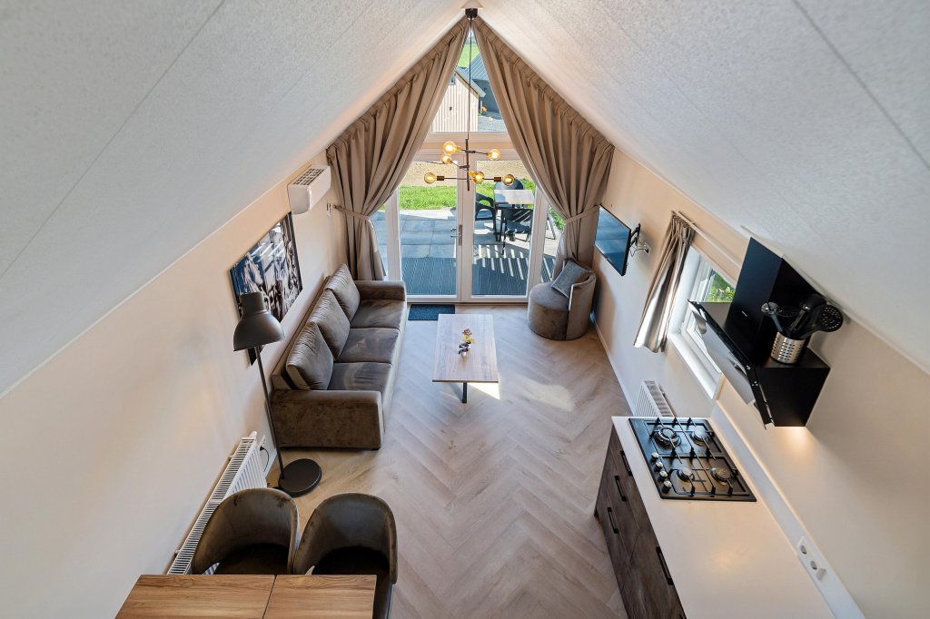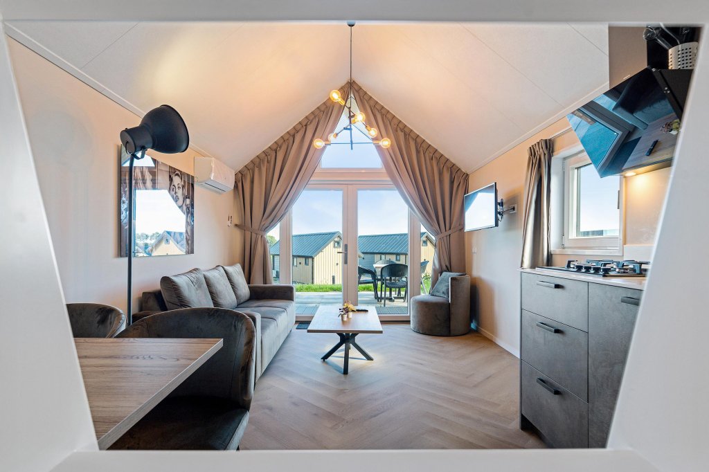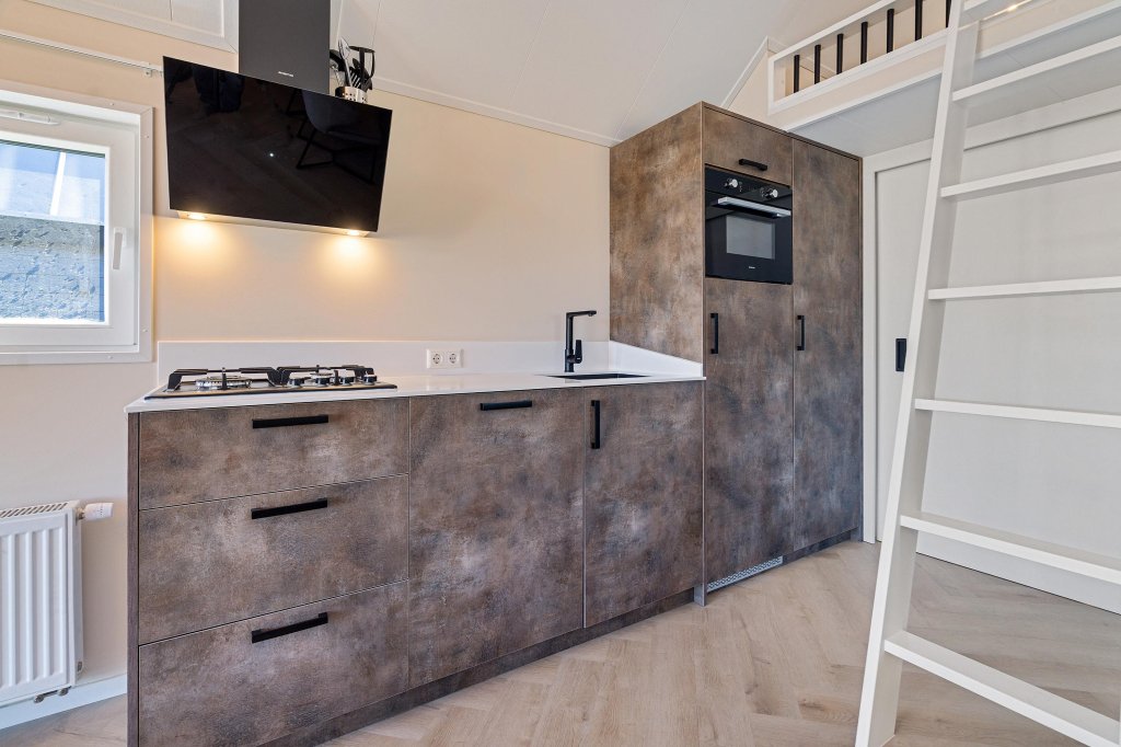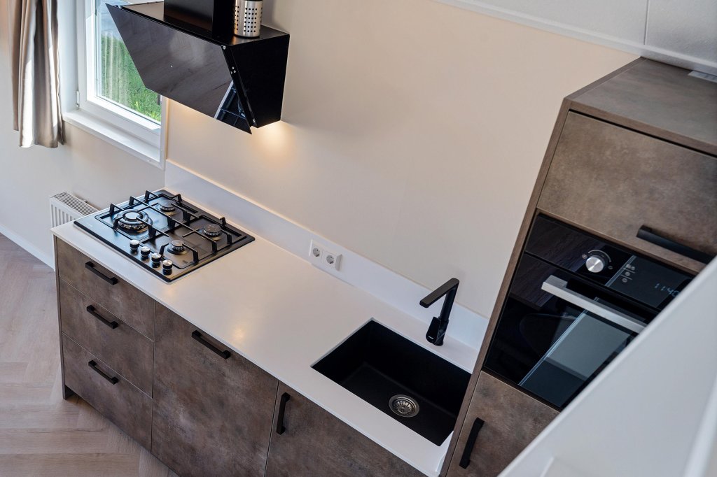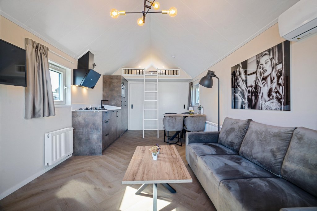 Via de overkapping en openslaande deuren betreedt u de woning. De gehele bungalow is voorzien van een stijlvolle visgraat PVC-vloer, wat zorgt voor een moderne en warme uitstraling. De woonkamer met gezellig zitgedeelte vormt het hart van de woning en is voorzien van een airco-unit, zodat u hier het hele jaar door van een aangenaam binnenklimaat kunt genieten. De open eetkamer sluit naadloos aan op de keuken, die van alle gemakken is voorzien, waaronder een 4-pits gasfornuis, afzuigkap, combi-oven, koelkast, vaatwasser, wasbak en voldoende opberglades.