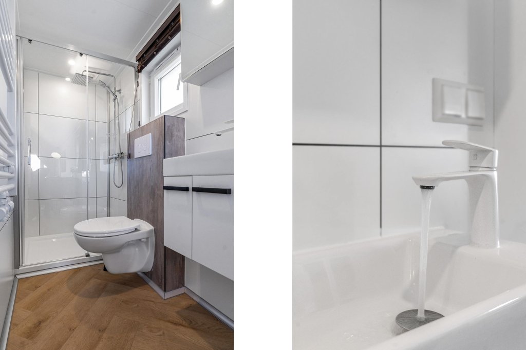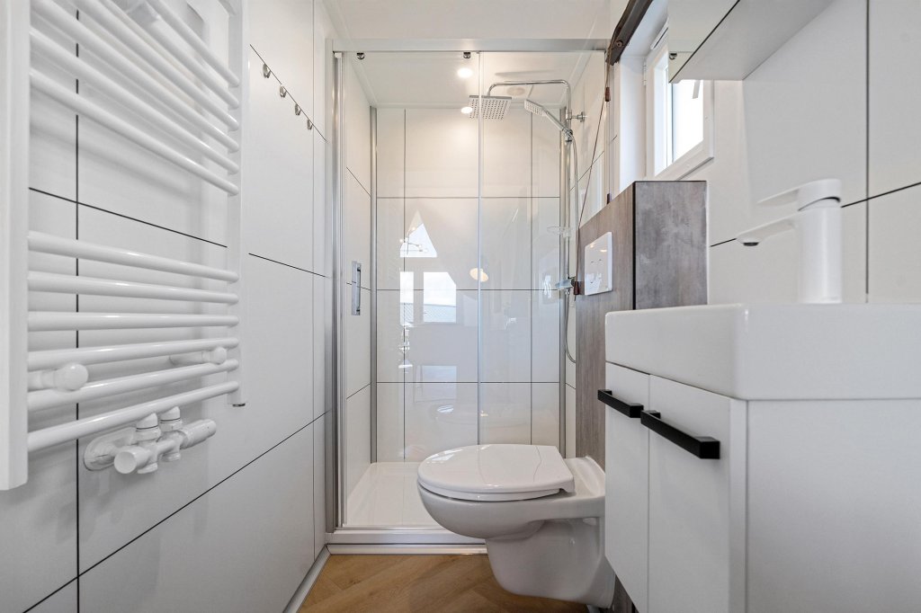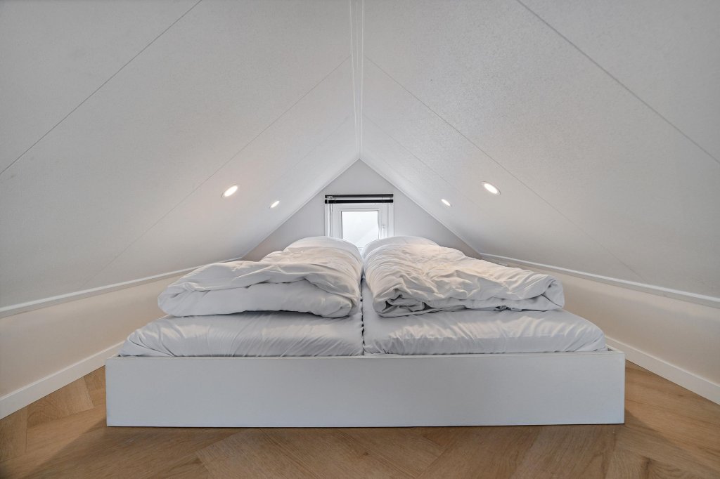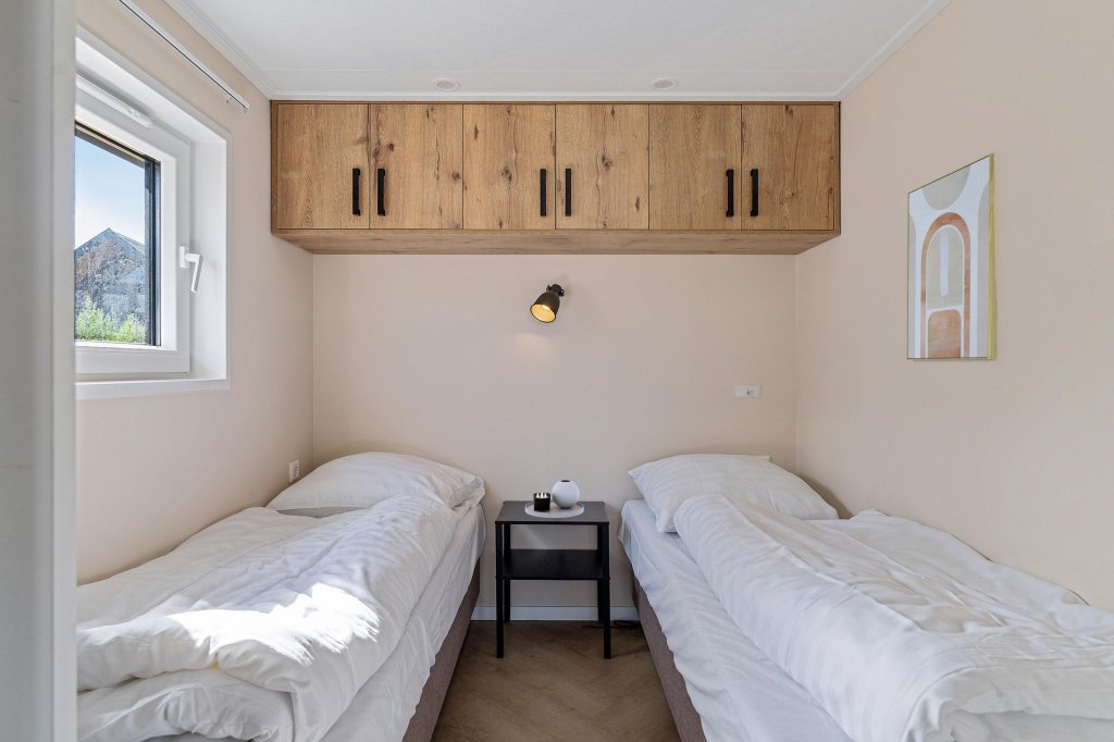 Naast de keuken bevinden zich de meterkast en cv-ketel. Vanuit deze ruimte heeft u via schuifdeuren toegang tot de slaapkamer en badkamer. De slaapkamer op de begane grond beschikt over twee eenpersoonsbedden en handige bovenkastjes voor extra bergruimte. De badkamer is compleet uitgevoerd met wastafel, wastafelmeubel, toilet en douche.