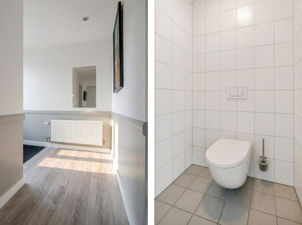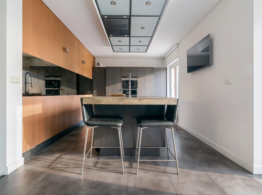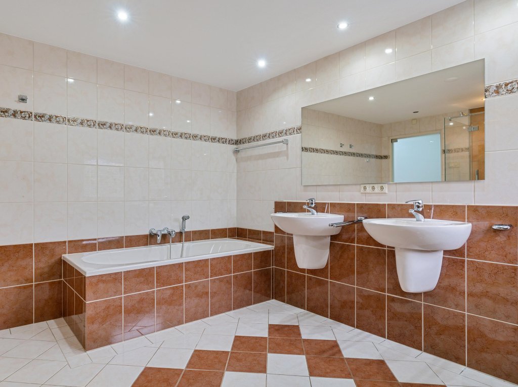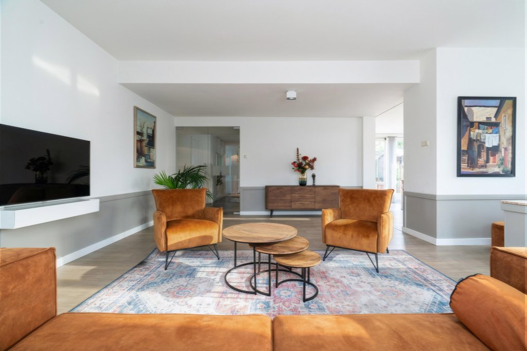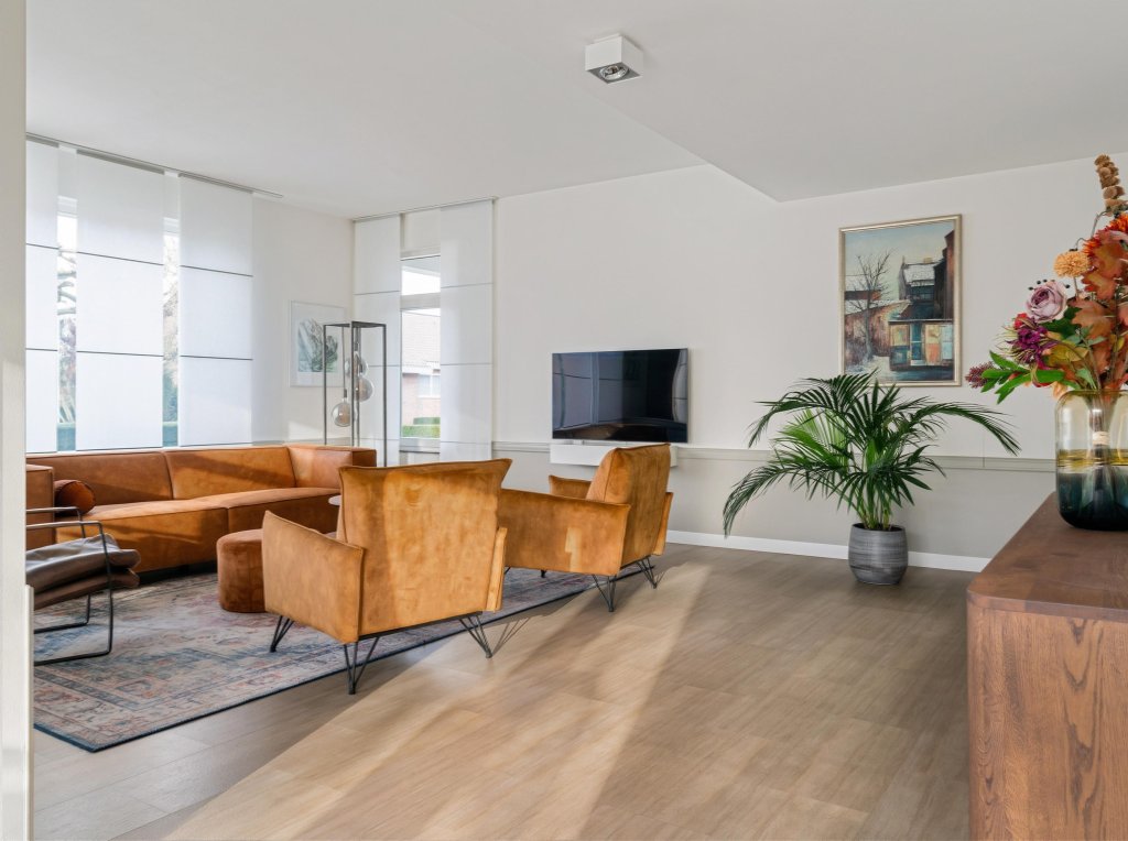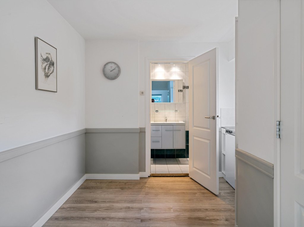 Via de verzorgde, onderhoudsvriendelijke voortuin bereik je de overdekte entree. De ruime hal biedt toegang tot de meterkast. Vanaf de hal is er toegang tot een verrassend ruime inloopkast, ideaal voor extra comfort en bergruimte. Vanuit de hal is tevens via een trap de kelderberging bereikbaar. De woning beschikt over een royale waskamer met wasmachineaansluiting, netjes weggewerkt in een op maat gemaakte kastenwand met volop bergruimte. Daarnaast is er een geheel betegelde toiletruimte met hangend closet en wastafelmeubel. De complete badkamer is eveneens volledig betegeld en uitgerust met een ligbad, douche, hangcloset en dubbele wastafel. De woon- en eetkamer vormen samen een bijzonder lichte en aangename leefruimte dankzij de grote raampartijen. Openslaande deuren in de eetkamer geven direct toegang tot de tuin en versterken het binnen-buitengevoel. Vanuit de eetkamer loop je door naar de keuken. De keuken is modern opgezet en voorzien van een kookeiland met inductiekookplaat en plafondafzuiging, spoelbak, koelkast, vriezer en diverse boven- en onderkasten.