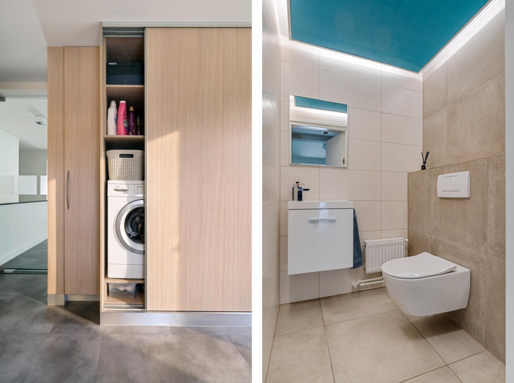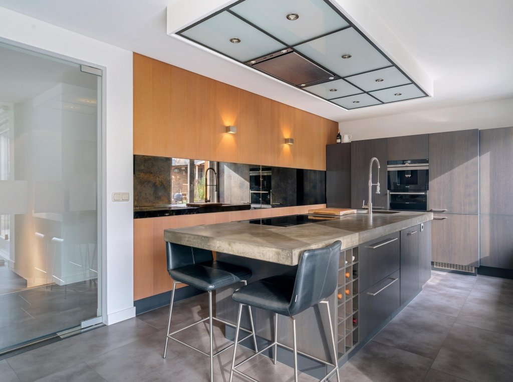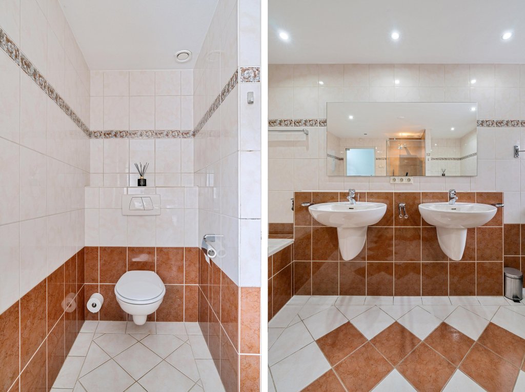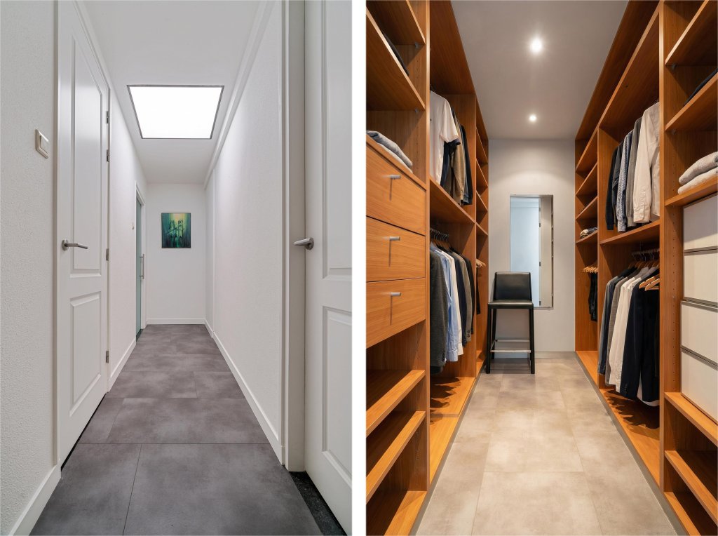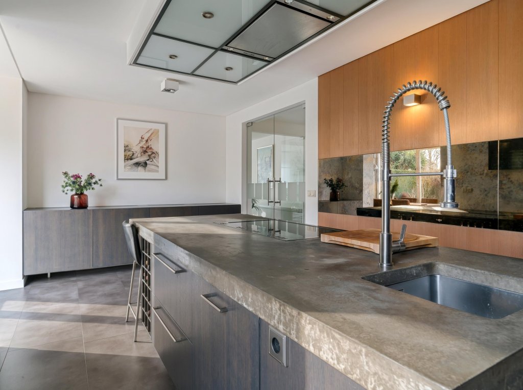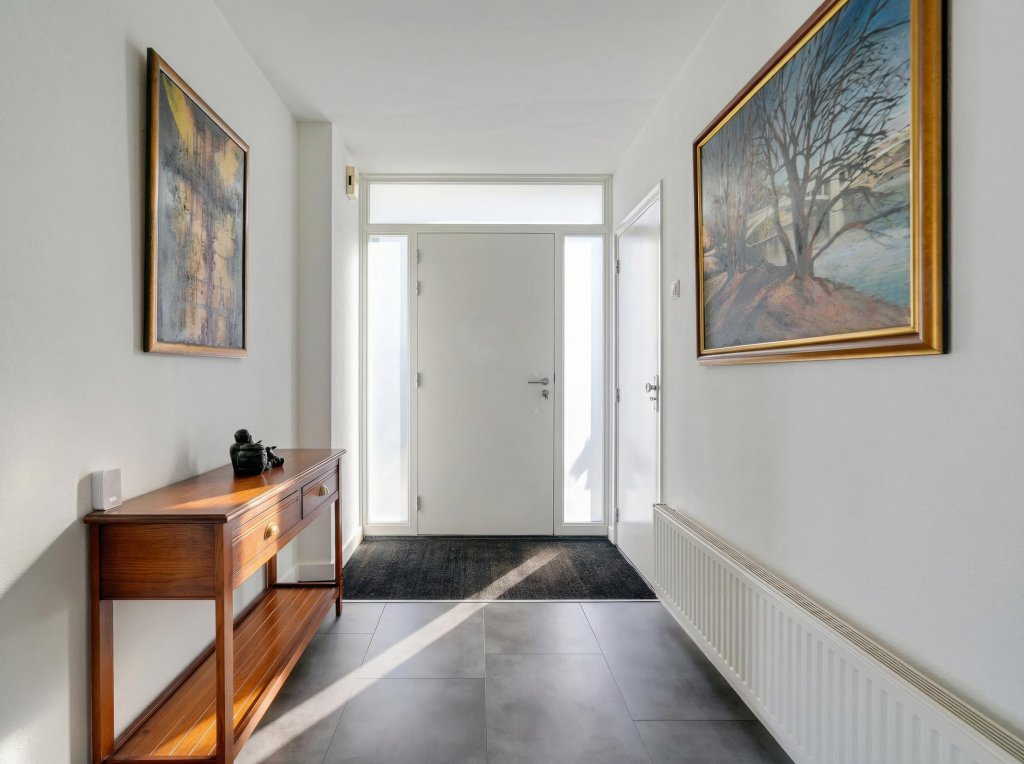 Via de verzorgde, onderhoudsvriendelijke voortuin bereik je de overdekte entree. De ruime hal biedt toegang tot de meterkast. Vanaf de hal is er toegang tot een verrassend ruime inloopkast, ideaal voor extra comfort en bergruimte. Vanuit de hal is tevens via een trap de kelderberging bereikbaar. De woning beschikt over een royale waskamer met wasmachineaansluiting, netjes weggewerkt in een op maat gemaakte kastenwand met volop bergruimte. Daarnaast is er een geheel betegelde toiletruimte met hangend closet en wastafelmeubel. De complete badkamer is eveneens volledig betegeld en uitgerust met een ligbad, douche, hangcloset en dubbele wastafel. De woon- en eetkamer vormen samen een bijzonder lichte en aangename leefruimte dankzij de grote raampartijen. Openslaande deuren in de eetkamer geven direct toegang tot de tuin en versterken het binnen-buitengevoel. Vanuit de eetkamer loop je door naar de keuken. De keuken is modern opgezet en voorzien van een kookeiland met inductiekookplaat en plafondafzuiging, spoelbak, koelkast, vriezer en diverse boven- en onderkasten.