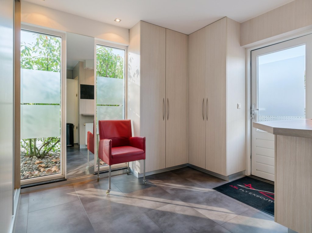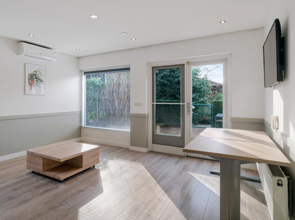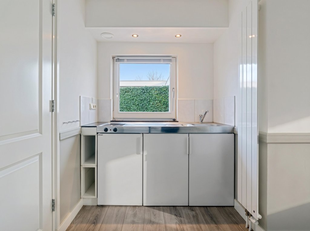 Naast de garage bevindt zich een aparte studio, bestaande uit een hal, woonkamer met vaste muurkast, slaapkamer, toilet, keuken en een badkamer met douche. Deze zelfstandige ruimte biedt volop mogelijkheden voor mantelzorg, gastenverblijf, verhuur of werken aan huis, met behoud van privacy.