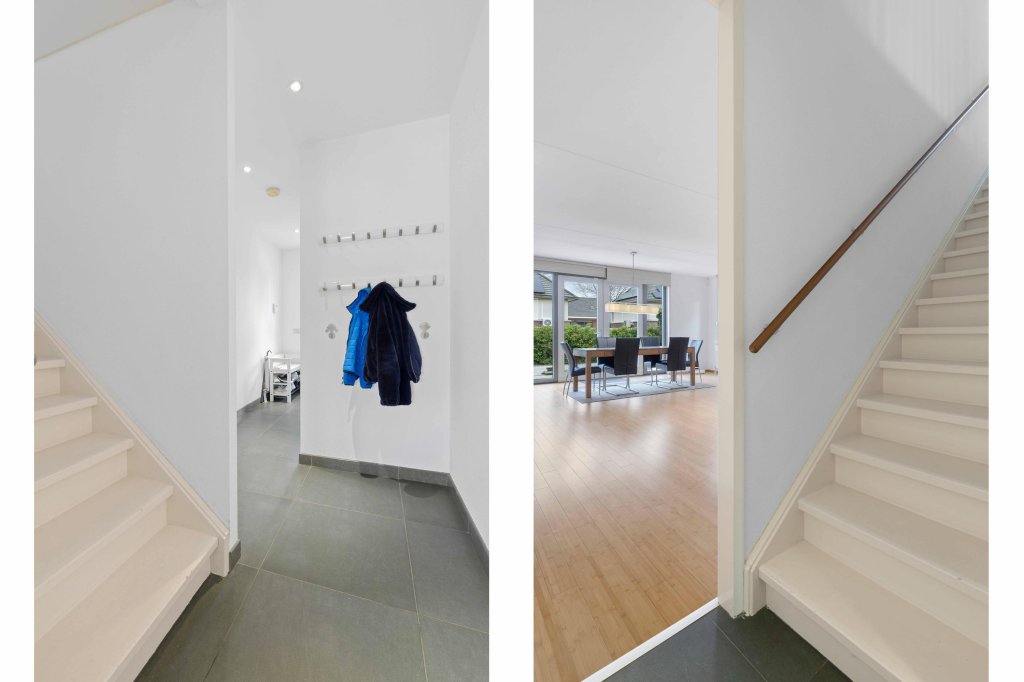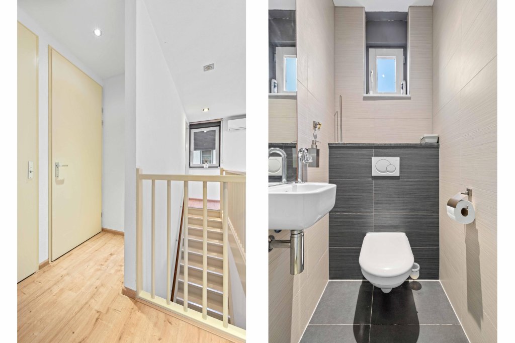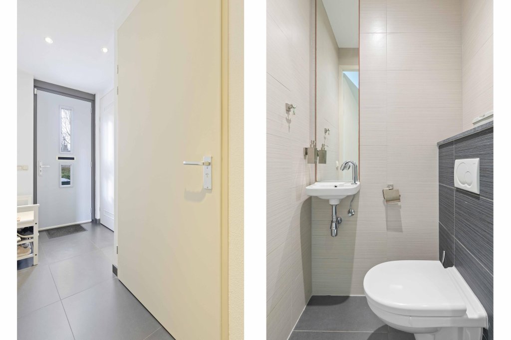 Via de ruime hal met fraaie tegelvloer betreedt u de woning. Hier bevinden zich de meterkast en de geheel betegelde toiletruimte met zwevend closet en fonteintje.