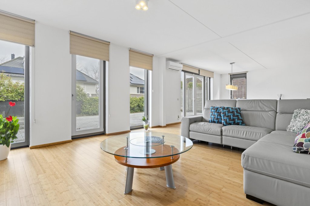 De royale L-vormige woonkamer (ca. 10.54mx 6.89/4.59m) is een prachtige leefruimte met parketvloer, airconditioning (2022) en openslaande tuindeuren naar de omsloten, beklinkerde tuin.