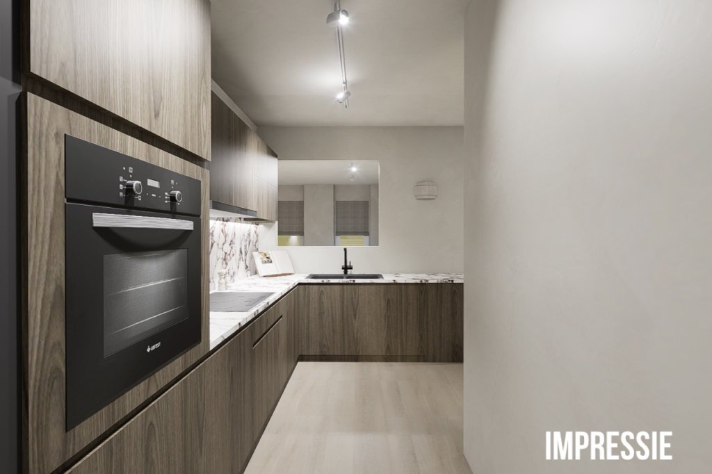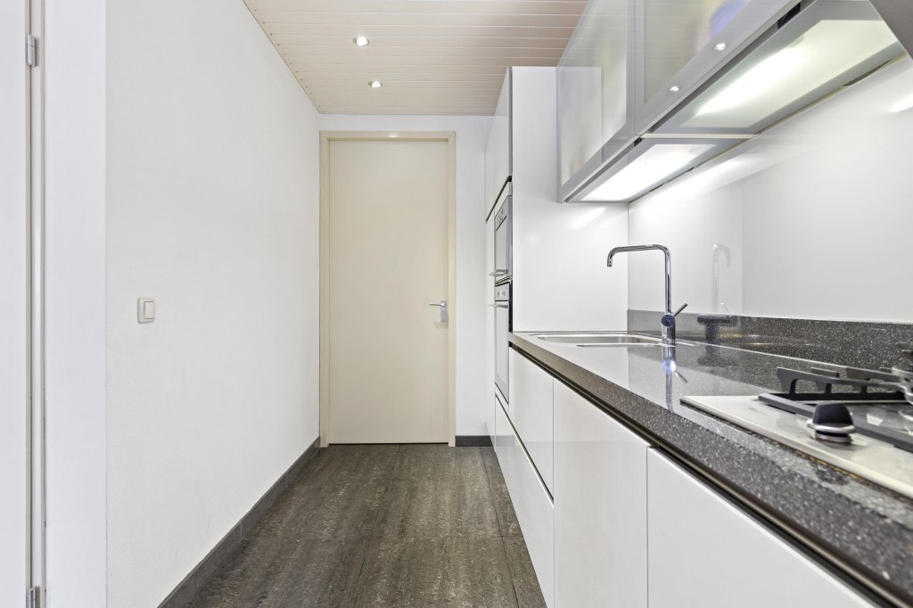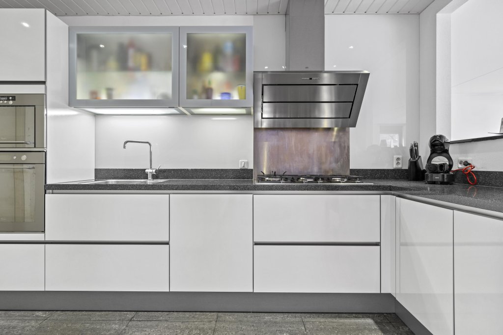 Semi-open keuken voorzien van stenen werkblad, 5-pits kooktoestel, rvs-wasemkap, koelkast, oven, magnetron en vaatwasser.