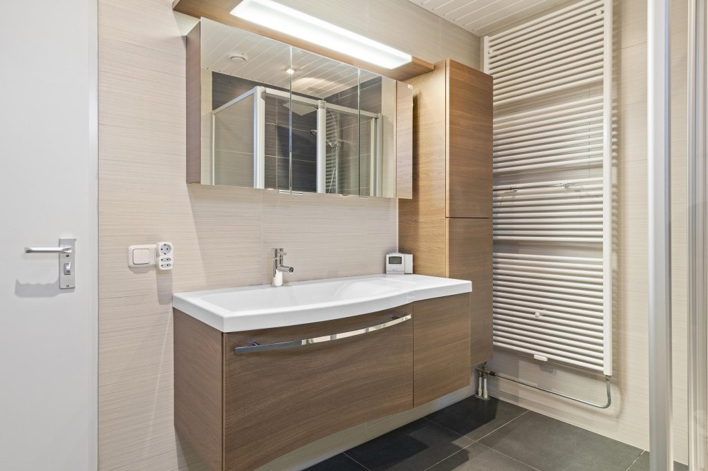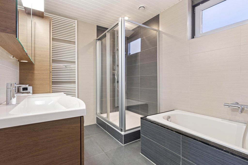 Moderne badkamer met ligbad, separate douche, vaste wastafel met meubel en designradiator.