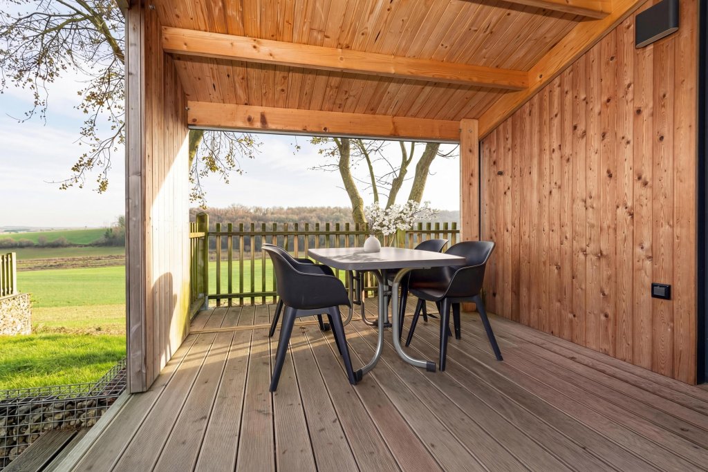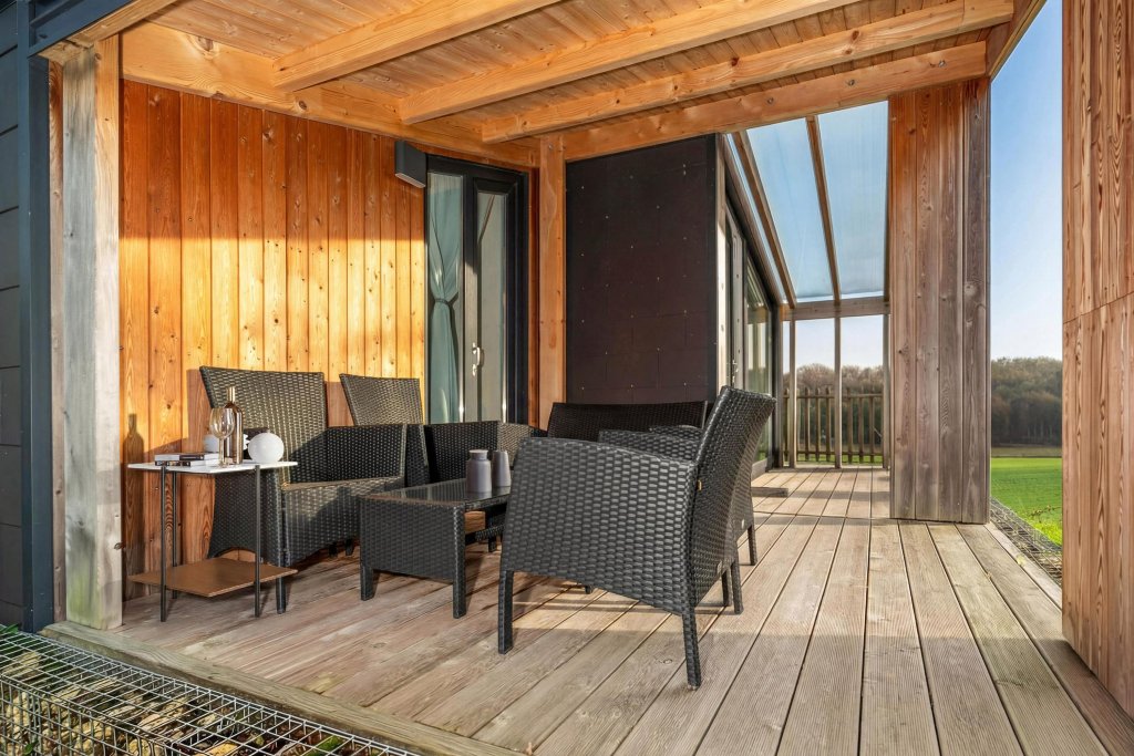 Ook buiten is het heerlijk vertoeven. De woning beschikt over een mooie, overdekte veranda waar je in alle rust kunt genieten van de frisse buitenlucht, het uitzicht en lange zomeravonden – ongeacht het weer.