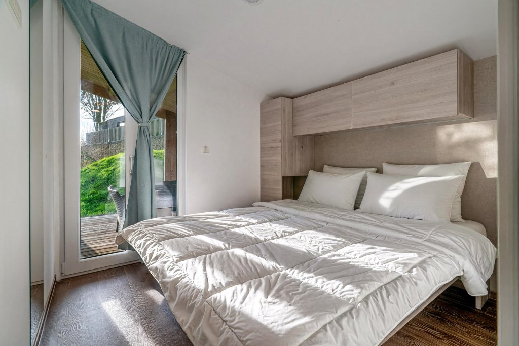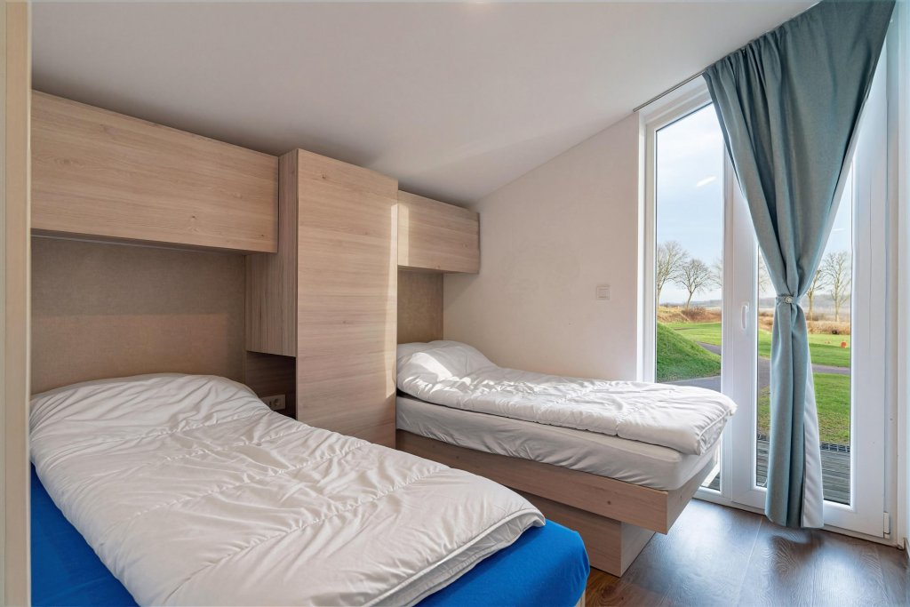 Bij binnenkomst betreed je de gezellige en lichte woonkamer, waar comfort en ontspanning centraal staan. Dankzij de praktische indeling voelt de ruimte prettig en uitnodigend aan. De open keuken sluit hier naadloos op aan en is efficiënt ingericht, voorzien van de benodigde apparatuur om ook tijdens je verblijf eenvoudig te koken en te genieten. De bungalow beschikt over twee comfortabele slaapkamers, ideaal voor een gezin of gasten. Eén van de slaapkamers is voorzien van een handige eigen bergkast, wat extra opbergruimte biedt tijdens langere verblijven. De nette badkamer is compleet uitgevoerd met een douche, wastafel en toilet en biedt alles wat je nodig hebt voor dagelijks comfort. Ook buiten is het heerlijk vertoeven. De woning beschikt over een mooie, overdekte veranda waar je in alle rust kunt genieten van de frisse buitenlucht, het uitzicht en lange zomeravonden – ongeacht het weer.