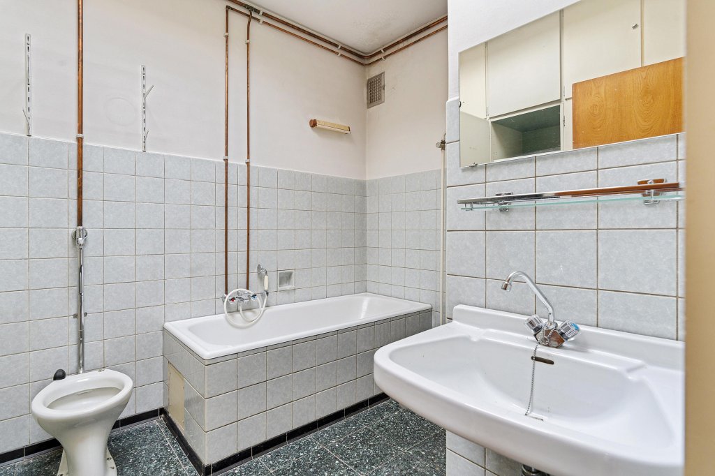 De badkamer is voorzien van een ligbad, hangcloset, wastafel en muurkast.