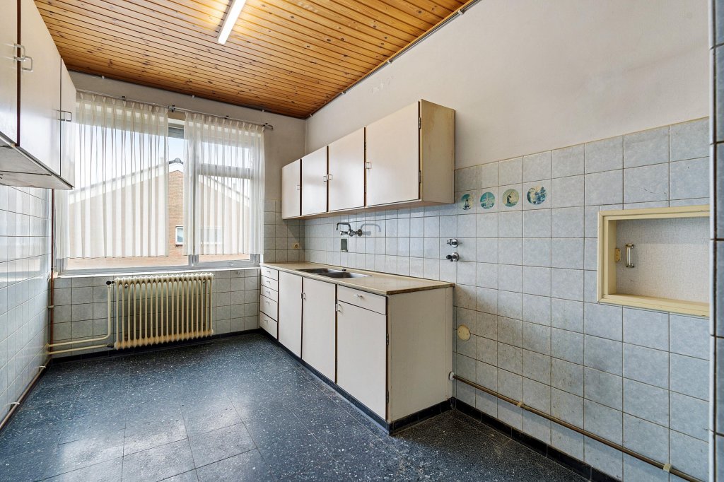 -De gesloten keuken is ingericht met een eenvoudig keukenblok.