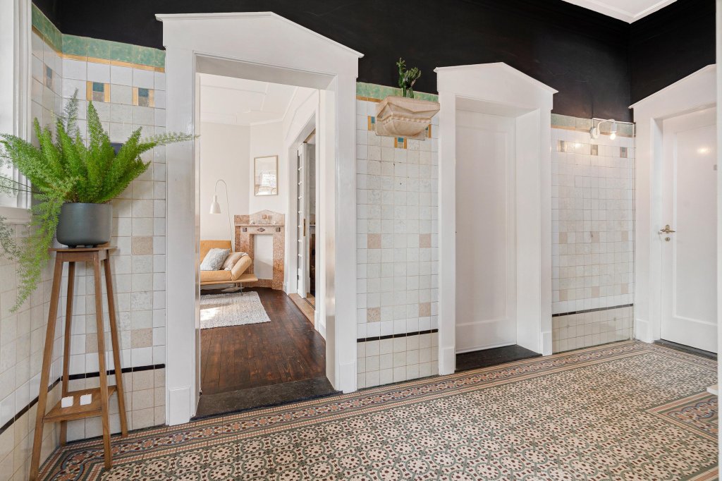 De overdekte entree leidt naar de statige ontvangsthal met originele plavuizenvloer, garderobe, trappenhuis en half betegelde toiletruimte met fonteintje.