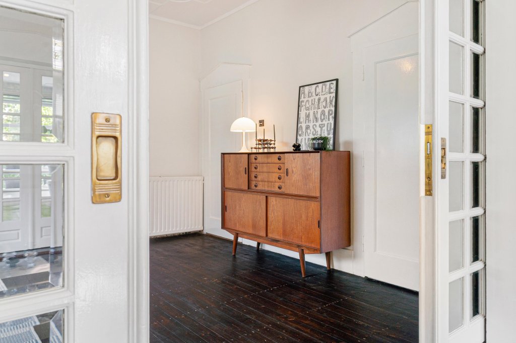 De woonkamer-ensuite met hoge plafonds is verdeeld in een zit- en eetgedeelte met originele plankenvloer, drie marmeren schouwen en originele schuifdeuren. Vanuit de woonkamer is er toegang tot de sfeervolle tuinkamer met Hongaarse puntvloer en uitzicht op de tuin.