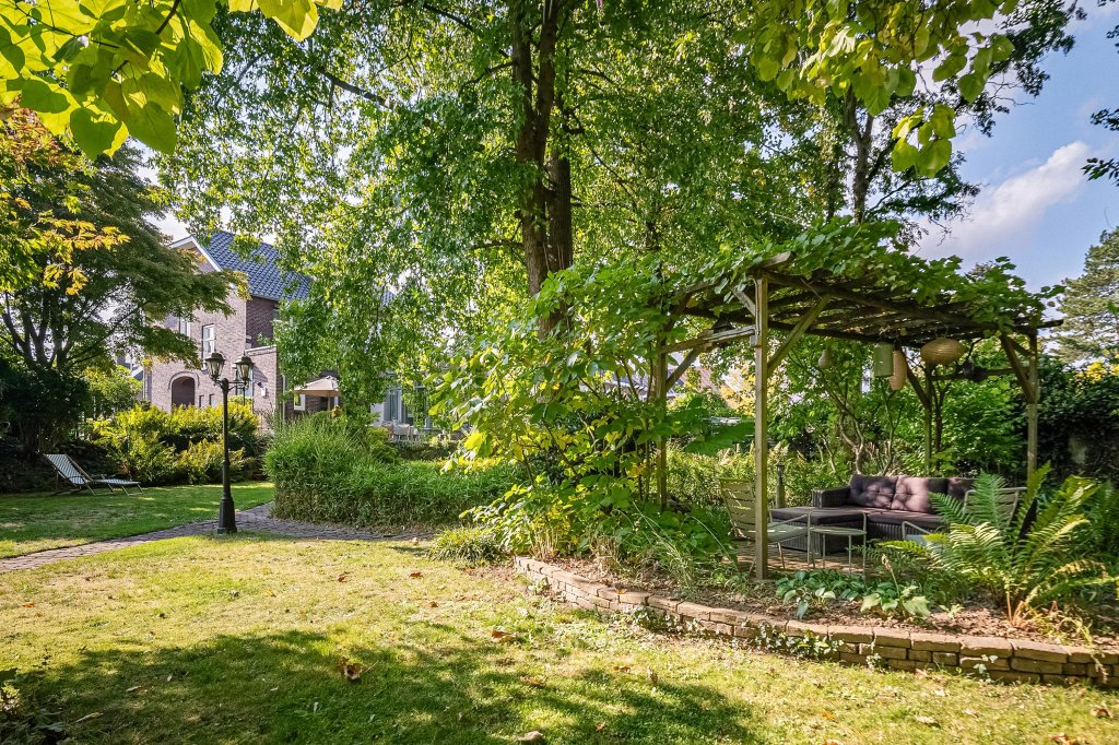 De tuin is sfeervol vormgegeven met meerdere terrassen, een pergola, volwassen beplanting, een stenen tuinhuis, vijverpartij, wandelpaden en zelfs een heus bosgebied aan de achterzijde van het perceel.
