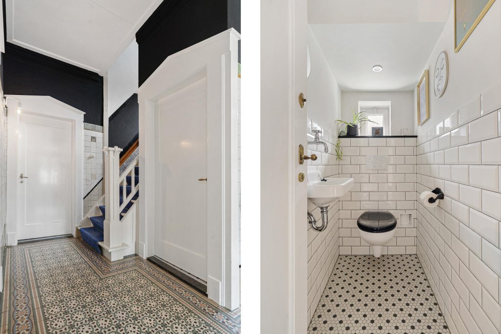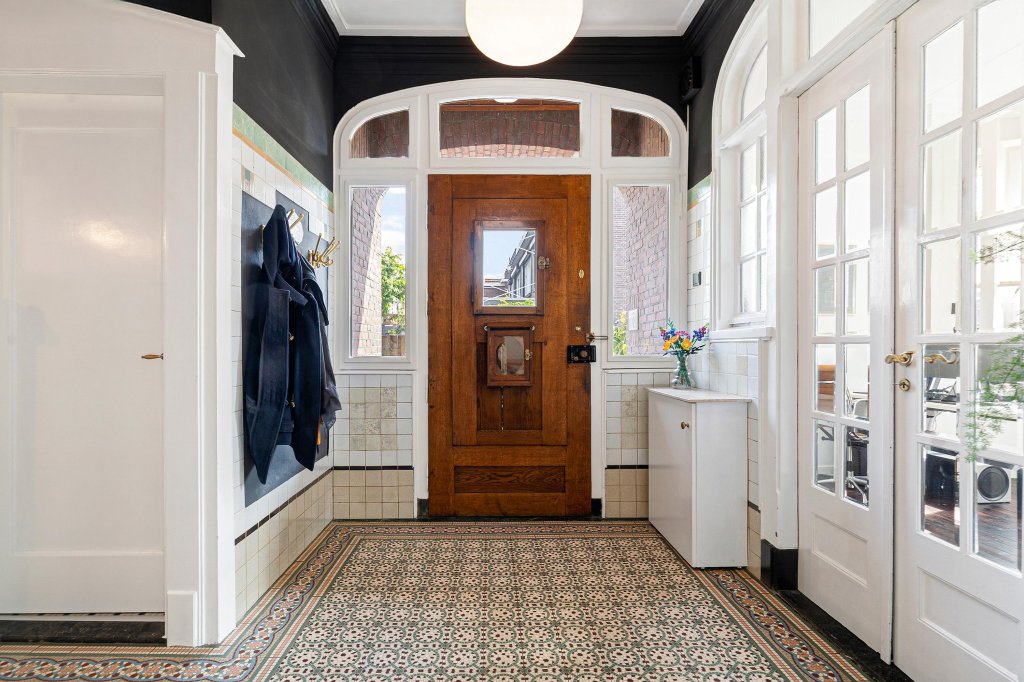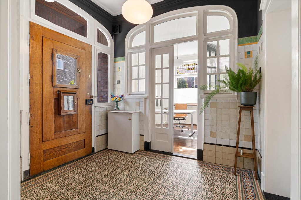 De overdekte entree leidt naar de statige ontvangsthal met originele plavuizenvloer, garderobe, trappenhuis en half betegelde toiletruimte met fonteintje.