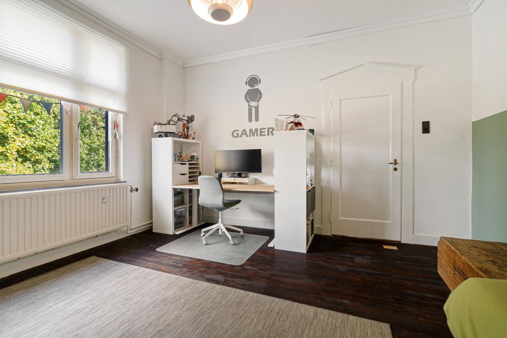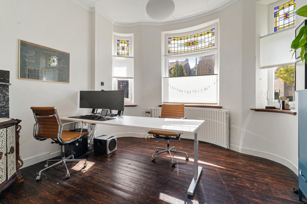 De werkkamer, voorzien van een prachtige ronde erker en schouw, is afgewerkt met prachtige elementen.