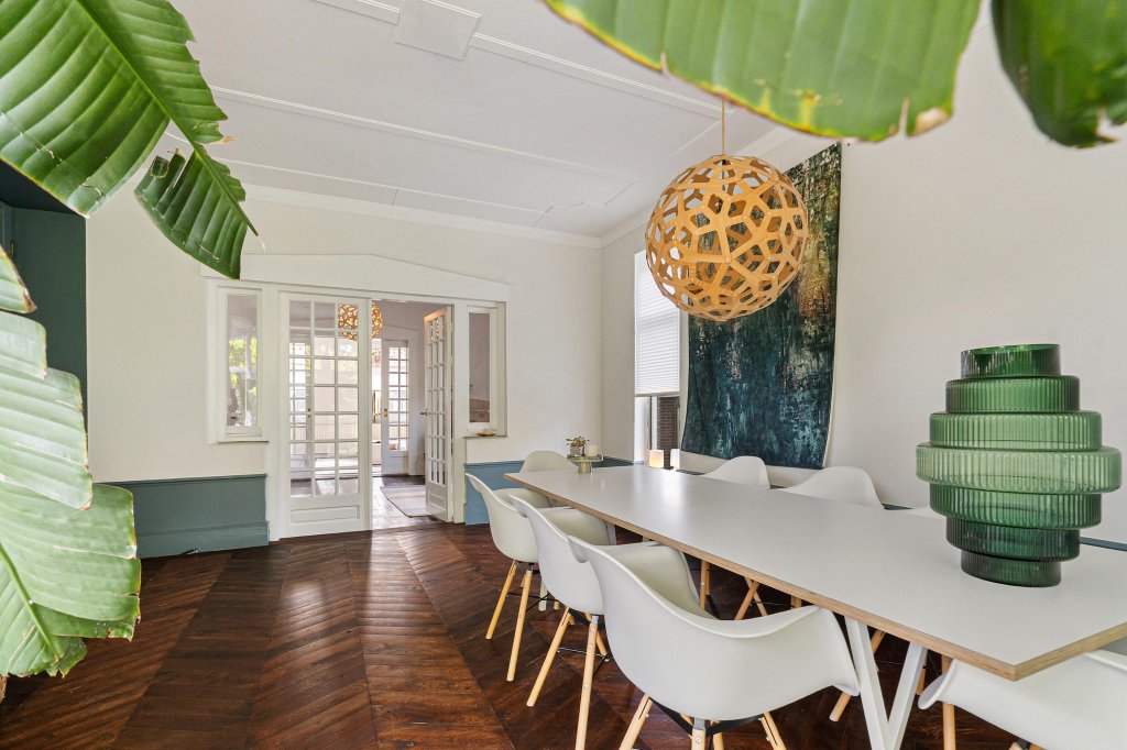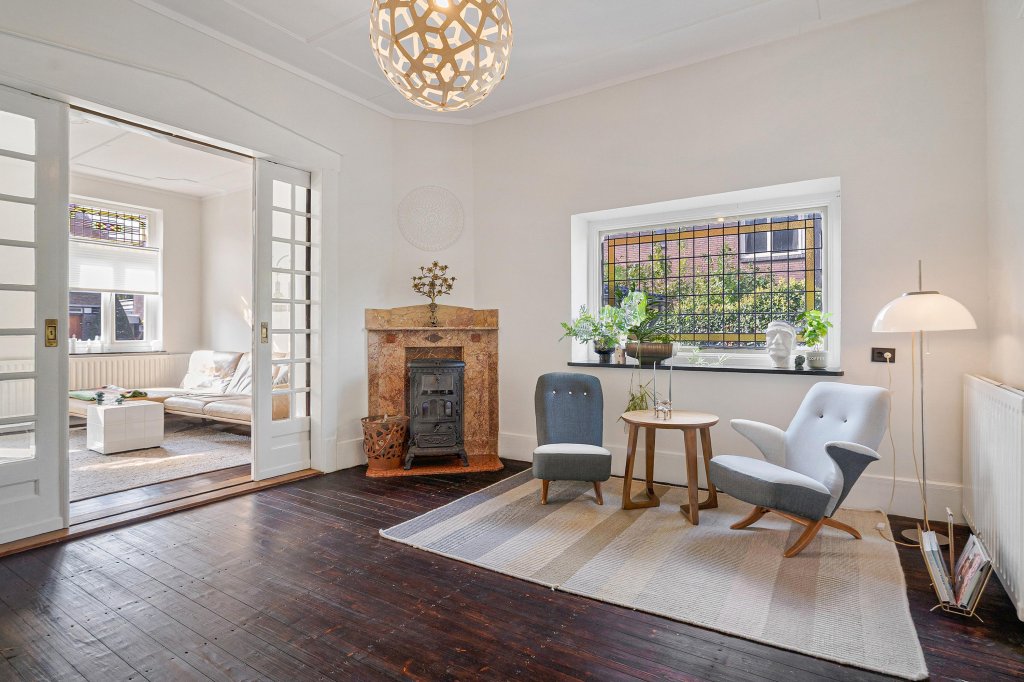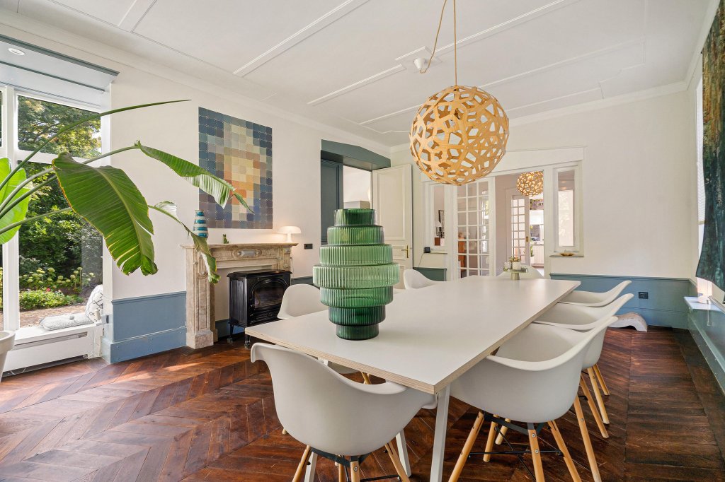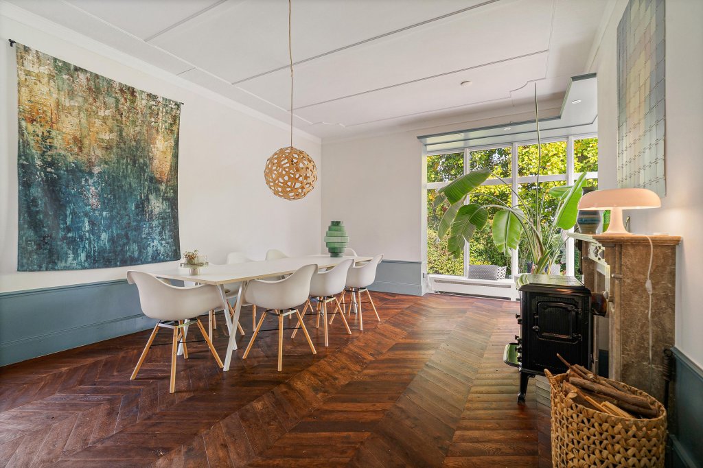 De woonkamer-ensuite met hoge plafonds is verdeeld in een zit- en eetgedeelte met originele plankenvloer, drie marmeren schouwen en originele schuifdeuren. Vanuit de woonkamer is er toegang tot de sfeervolle tuinkamer met Hongaarse puntvloer en uitzicht op de tuin.