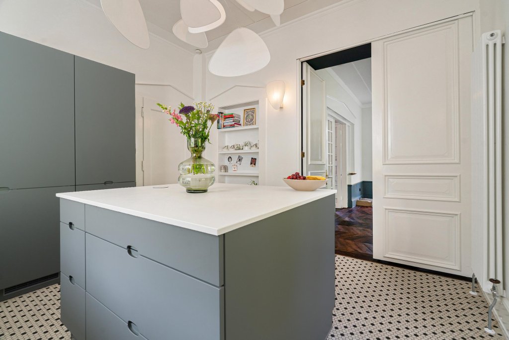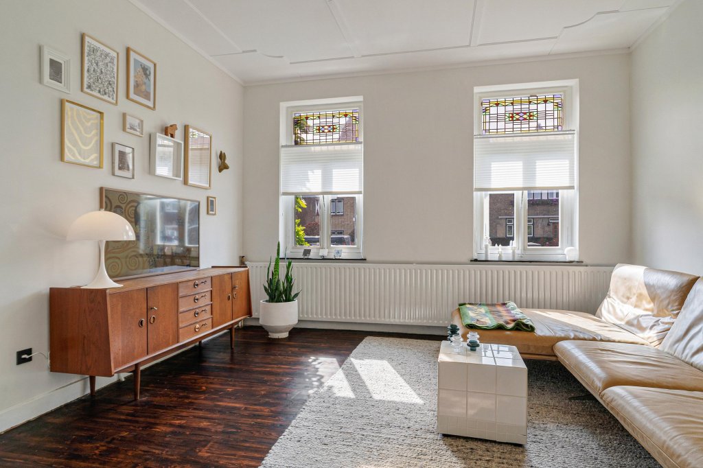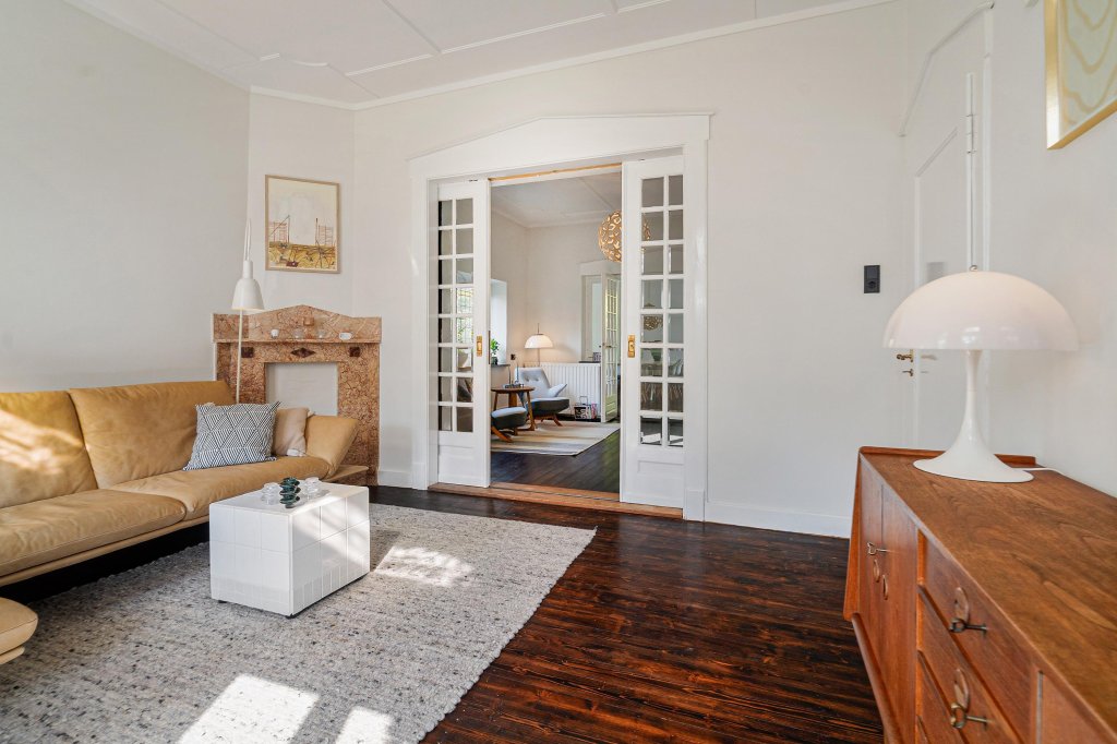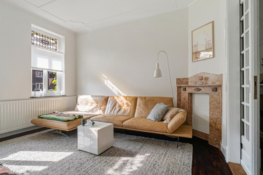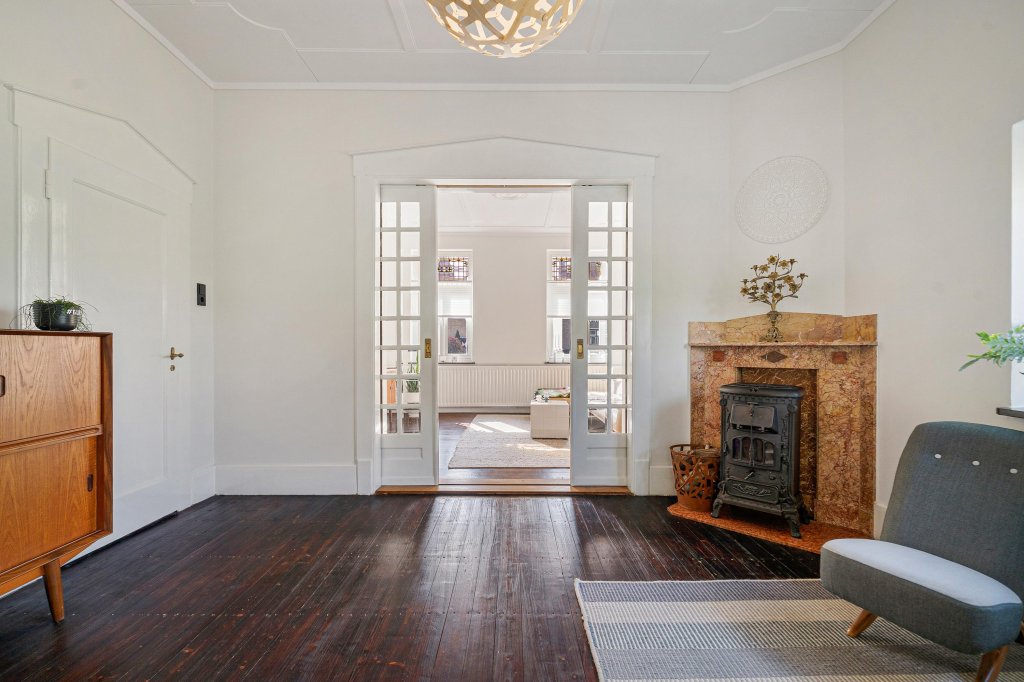 De woonkamer-ensuite met hoge plafonds is verdeeld in een zit- en eetgedeelte met originele plankenvloer, drie marmeren schouwen en originele schuifdeuren. Vanuit de woonkamer is er toegang tot de sfeervolle tuinkamer met Hongaarse puntvloer en uitzicht op de tuin.