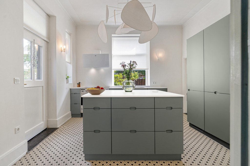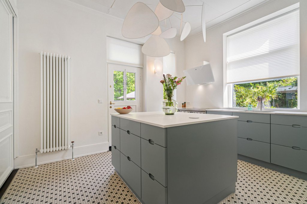 De gesloten, lichte leefkeuken is ingericht met een complete moderne keukenopstelling met kookeiland en voorzien van diverse apparatuur: een combinatie inductie (6-pits)/oven (merk Smeg), vaatwasser, koel-/vriescombinatie en Quooker. Vanuit de keuken is er toegang tot de kelder en het terras met prachtig uitzicht op de aangelegde tuin.