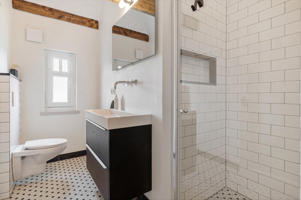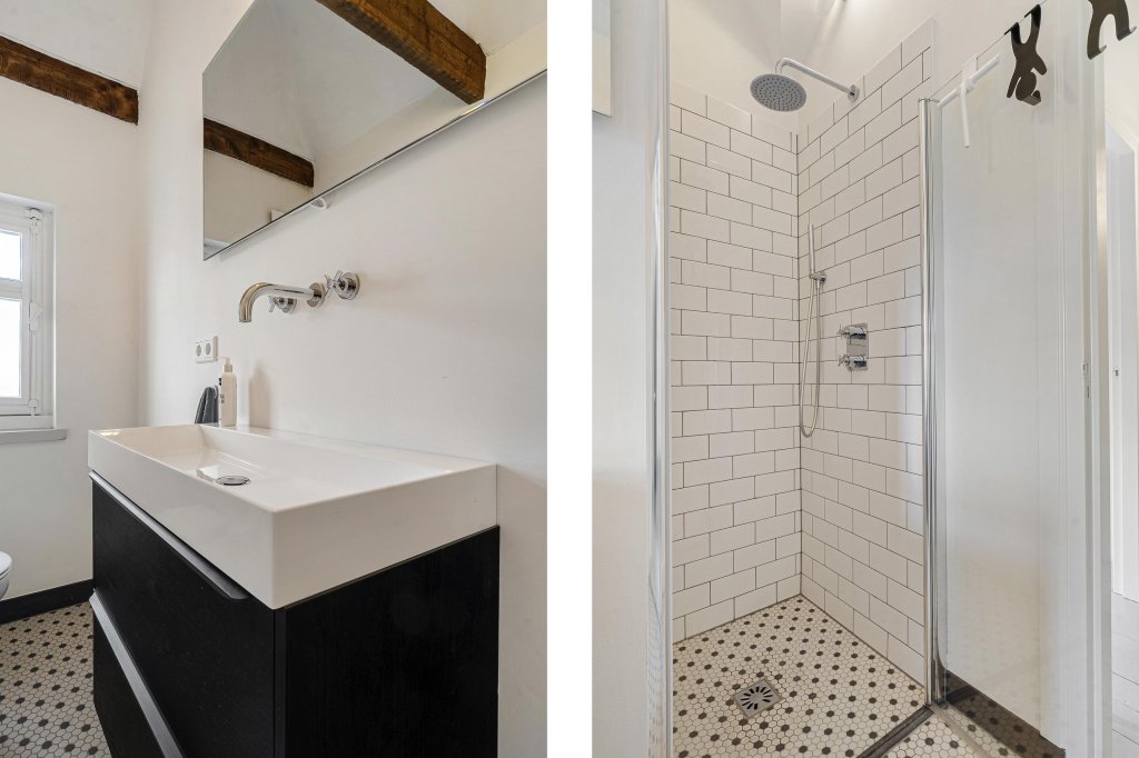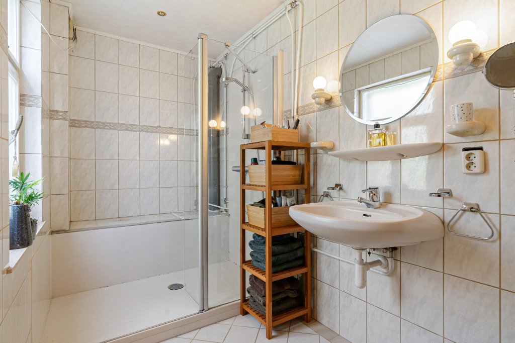 De badkamer is geheel betegeld en beschikt over een inloopdouche, tweede toilet en wastafel.