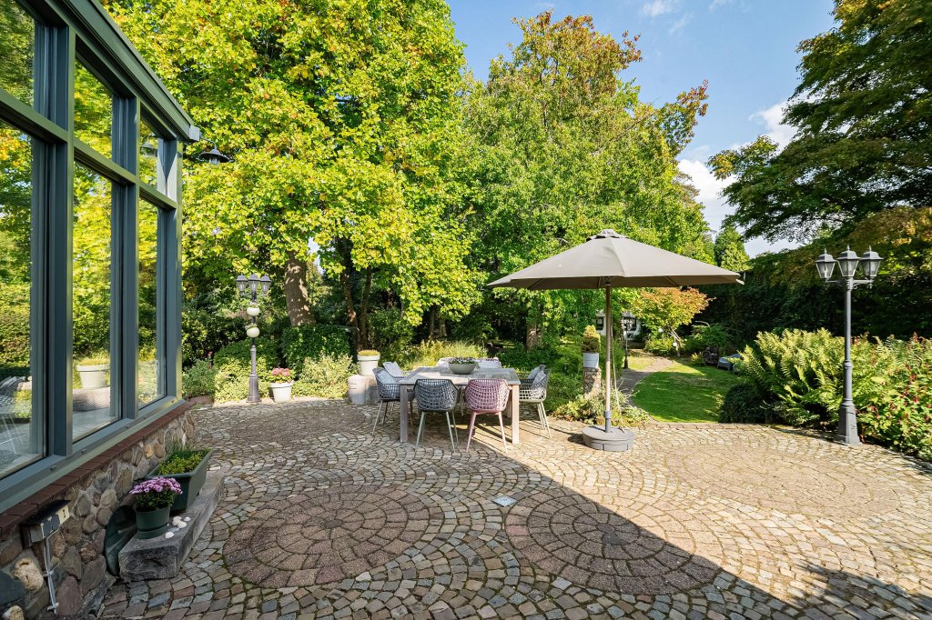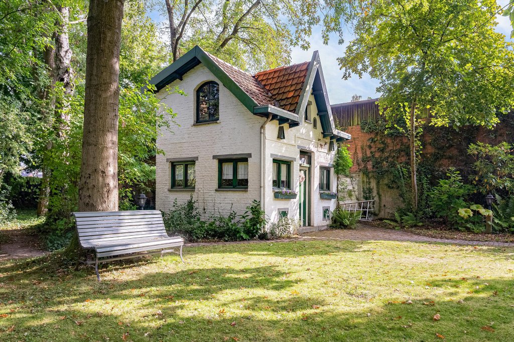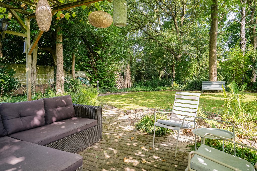 De tuin is sfeervol vormgegeven met meerdere terrassen, een pergola, volwassen beplanting, een stenen tuinhuis, vijverpartij, wandelpaden en zelfs een heus bosgebied aan de achterzijde van het perceel.