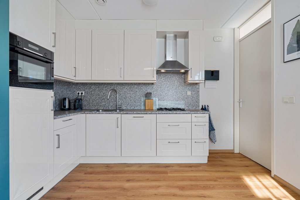 De open keuken in hoekopstelling is praktisch ingericht en uitgerust met inbouwapparatuur: een 4-pits gasfornuis, afzuigkap, koelkast, combi-oven, vaatwasser en voldoende kastruimte.