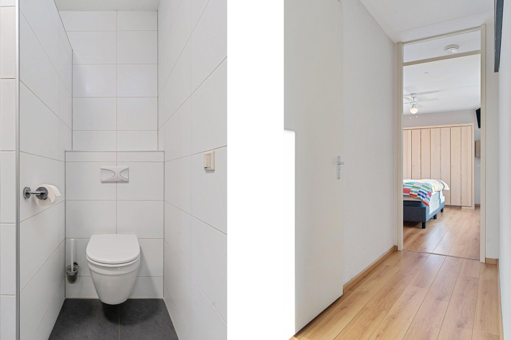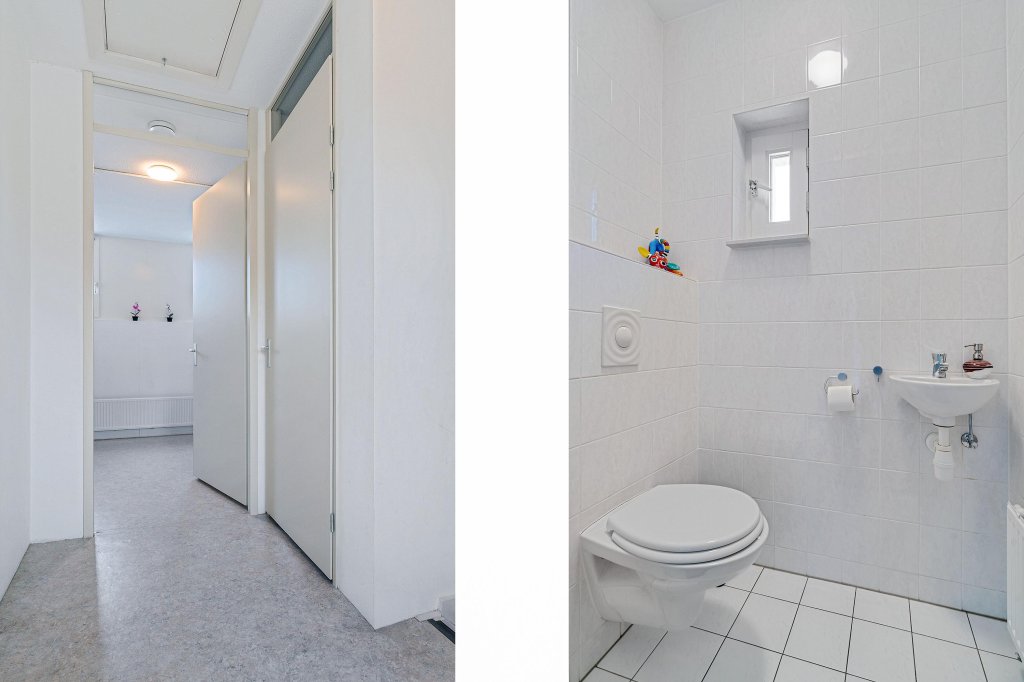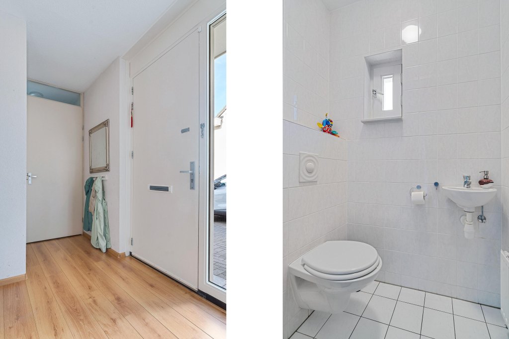 Bij aankomst treft u een nette oprit met toegang tot de inpandige garage en de hoofdentree van de woning. Via de hal bereikt u de meterkast en het volledig betegelde toilet met zwevend closet en fonteintje.