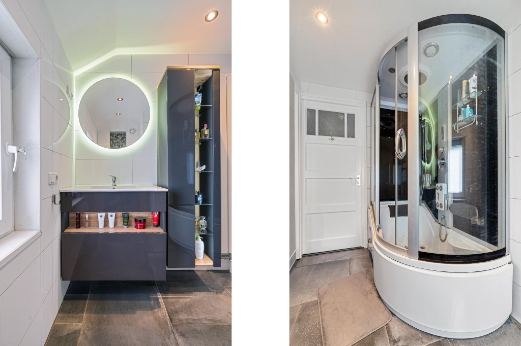 De badkamer is voorzien met een zitbad/massagedouche, een toilet en een wastafel met meubel.
